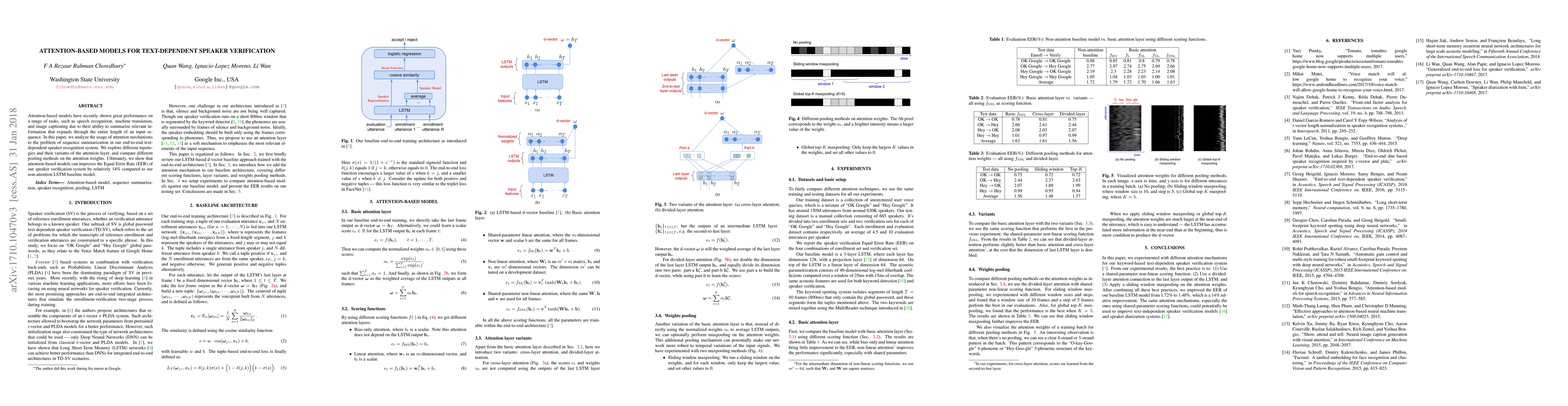 This paper investigates the application of attention mechanisms in text-dependent speaker verification, showing that they enhance performance by improving the Equal Error Rate (EER) by 14% compared to a baseline LSTM model. The study explores various attention layer topologies and pooling methods to optimize sequence summarization.