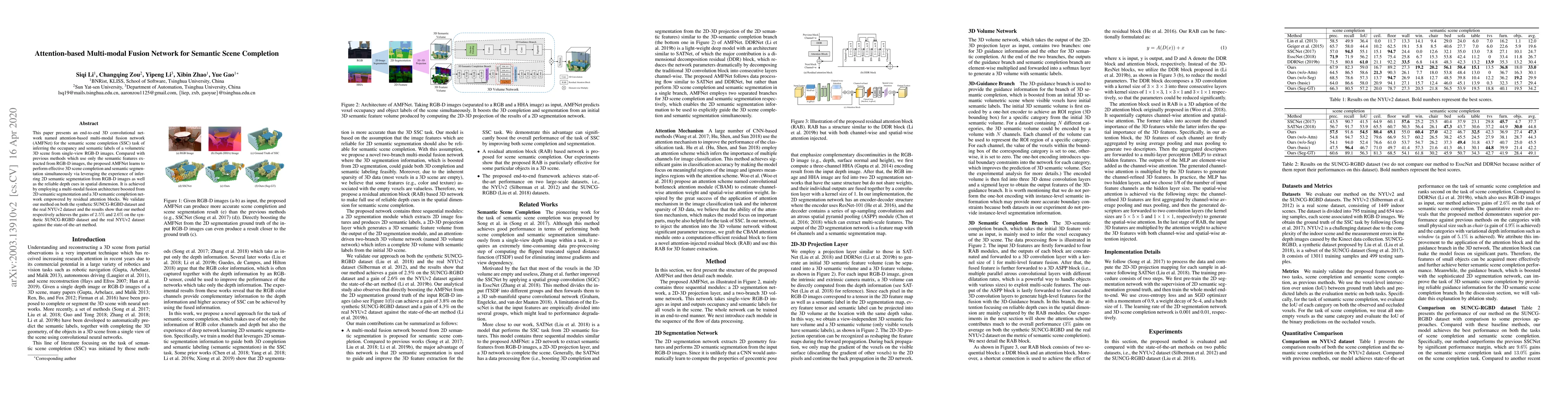 This paper introduces an attention-based multi-modal fusion network (AMFNet) for semantic scene completion, achieving simultaneous 3D scene completion and semantic segmentation from single-view RGB-D images. The method outperforms state-of-the-art by leveraging 2D semantic segmentation and depth cues, showing gains of 2.5% and 2.6% on synthetic and real datasets respectively.