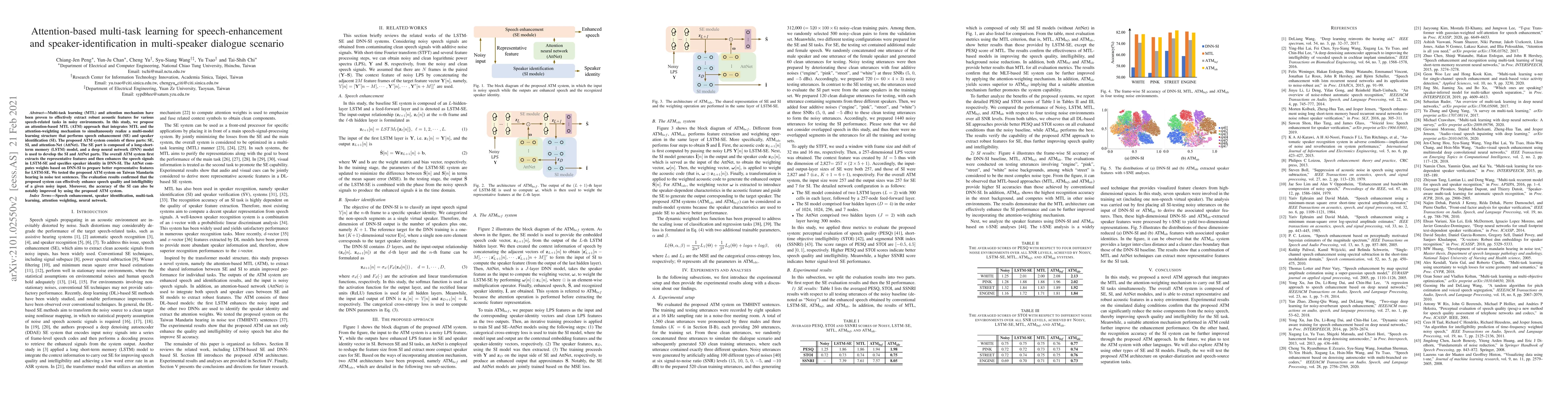 Multi-task learning (MTL) and attention mechanism have been proven to effectively extract robust acoustic features for various speech-related tasks in noisy environments. In this study, we propose an attention-based MTL (ATM) approach that integrates MTL and the attention-weighting mechanism to simultaneously realize a multi-model learning structure that performs speech enhancement (SE) and speaker identification (SI). The proposed ATM system consists of three parts: SE, SI, and attention-Net (AttNet). The SE part is composed of a long-short-term memory (LSTM) model, and a deep neural network (DNN) model is used to develop the SI and AttNet parts. The overall ATM system first extracts the representative features and then enhances the speech signals in LSTM-SE and specifies speaker identity in DNN-SI. The AttNet computes weights based on DNN-SI to prepare better representative features for LSTM-SE. We tested the proposed ATM system on Taiwan Mandarin hearing in noise test sentences. The evaluation results confirmed that the proposed system can effectively enhance speech quality and intelligibility of a given noisy input. Moreover, the accuracy of the SI can also be notably improved by using the proposed ATM system.