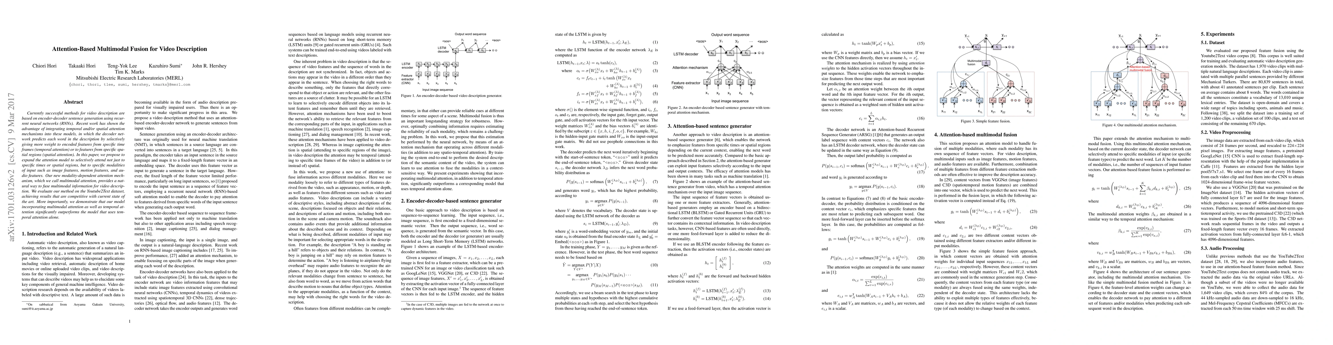 This paper proposes a multimodal attention mechanism to enhance video description by integrating image, motion, and audio features. The model outperforms existing temporal attention-based methods, demonstrating the effectiveness of fusing multimodal inputs for generating video descriptions.