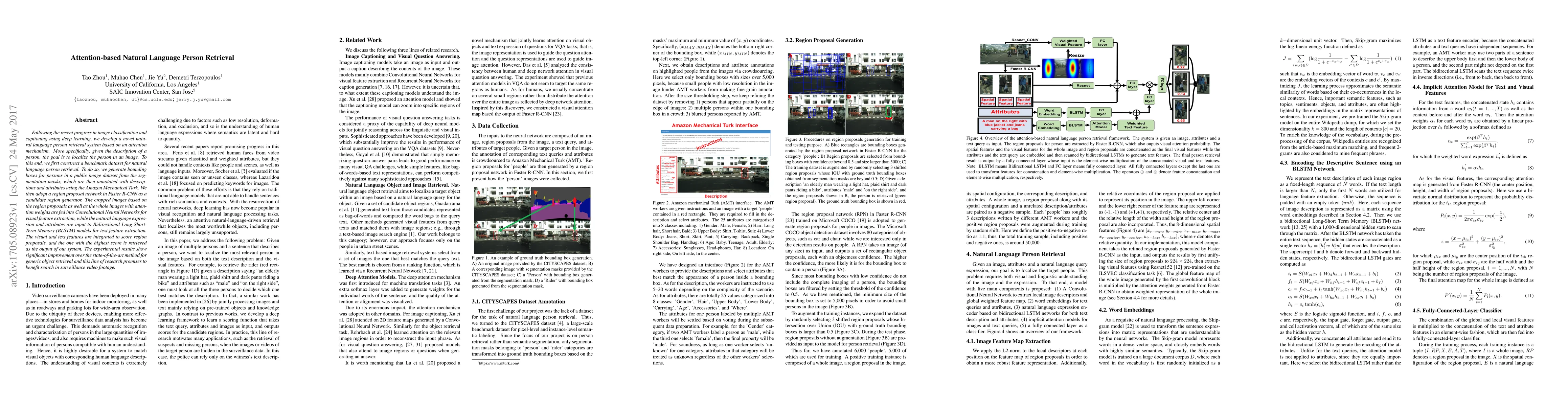 This paper introduces a novel natural language person retrieval system using an attention mechanism to localize individuals described in text within images. The system combines visual and textual features extracted from cropped regions and full images, showing significant improvement over existing object retrieval methods.