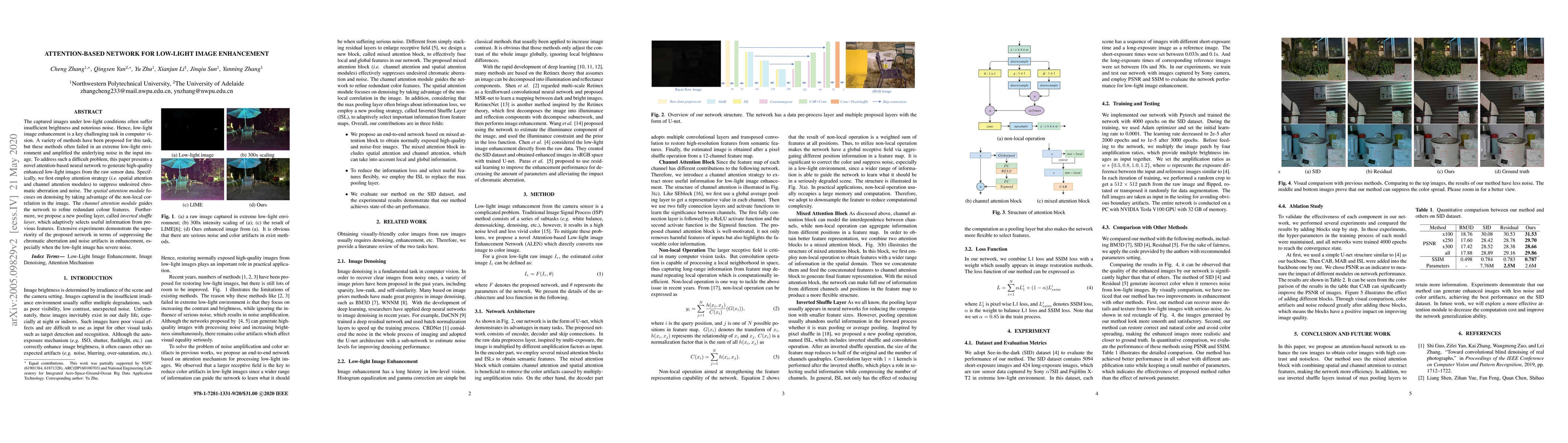This paper introduces an attention-based neural network for enhancing low-light images, employing channel and spatial attention modules to suppress noise and chromatic aberration. The proposed inverted shuffle layer adaptively selects useful features, demonstrating superior performance in generating high-quality images, especially in extreme low-light conditions.