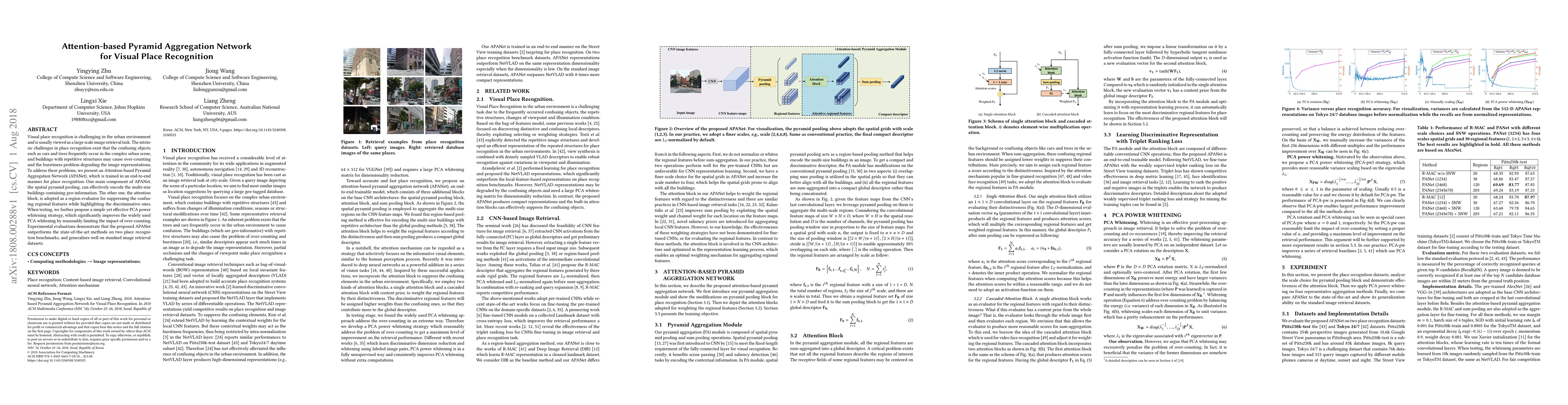 The paper proposes an Attention-based Pyramid Aggregation Network (APANet) for visual place recognition, utilizing spatial pyramid pooling and attention blocks to encode multi-scale buildings and suppress confusing features. The method also introduces a PCA power whitening strategy to enhance representation, outperforming state-of-the-art on benchmarks.