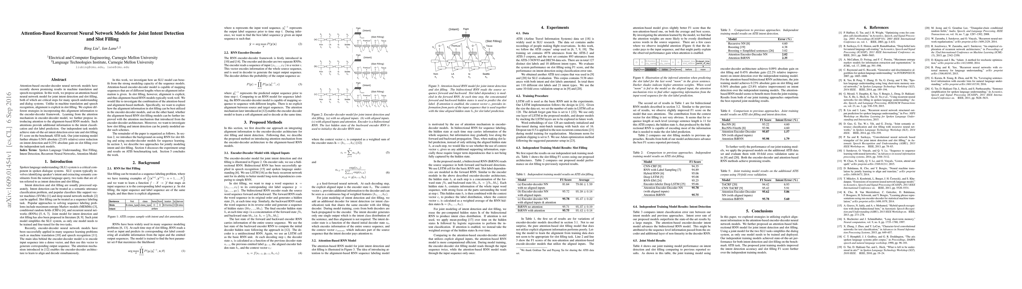 This paper proposes an attention-based neural network model for joint intent detection and slot filling, achieving state-of-the-art results on the ATIS benchmark. The joint training model shows significant improvements over independent task models, demonstrating the effectiveness of the proposed attention mechanisms.