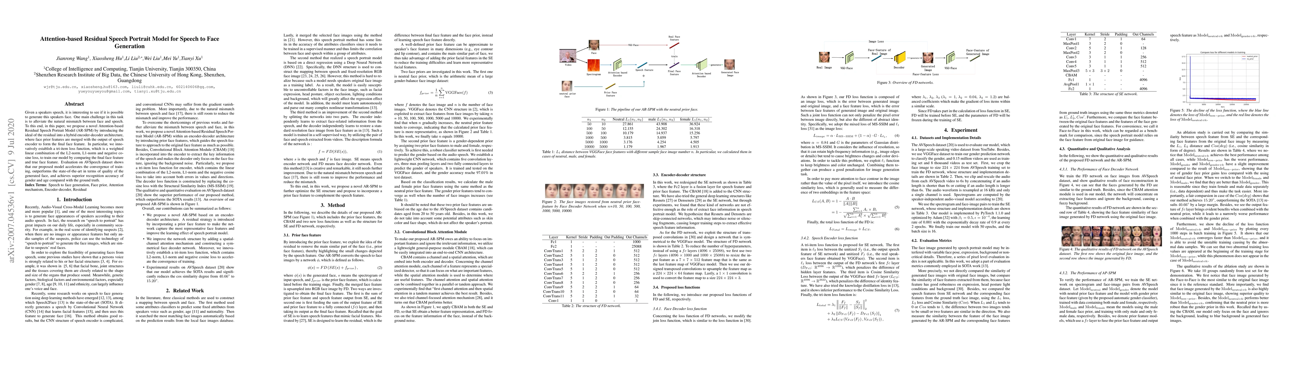The paper proposes an Attention-based Residual Speech Portrait Model (AR-SPM) to generate a speaker's face from their speech, addressing the mismatch between face and speech. The model combines residual learning with a hybrid encoder-decoder architecture and a tri-item loss function, achieving superior convergence, face quality, and gender/age recognition accuracy compared to state-of-the-art methods.