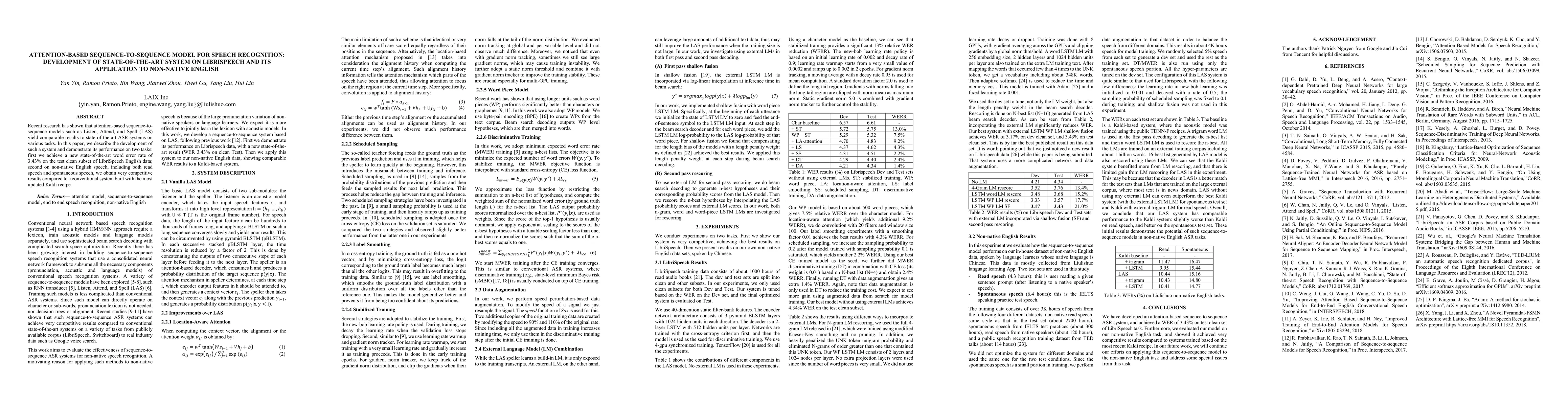 This paper develops an attention-based sequence-to-sequence model that achieves a new state-of-the-art word error rate of 3.43% on LibriSpeech English data, also yielding competitive results on non-native English speech.