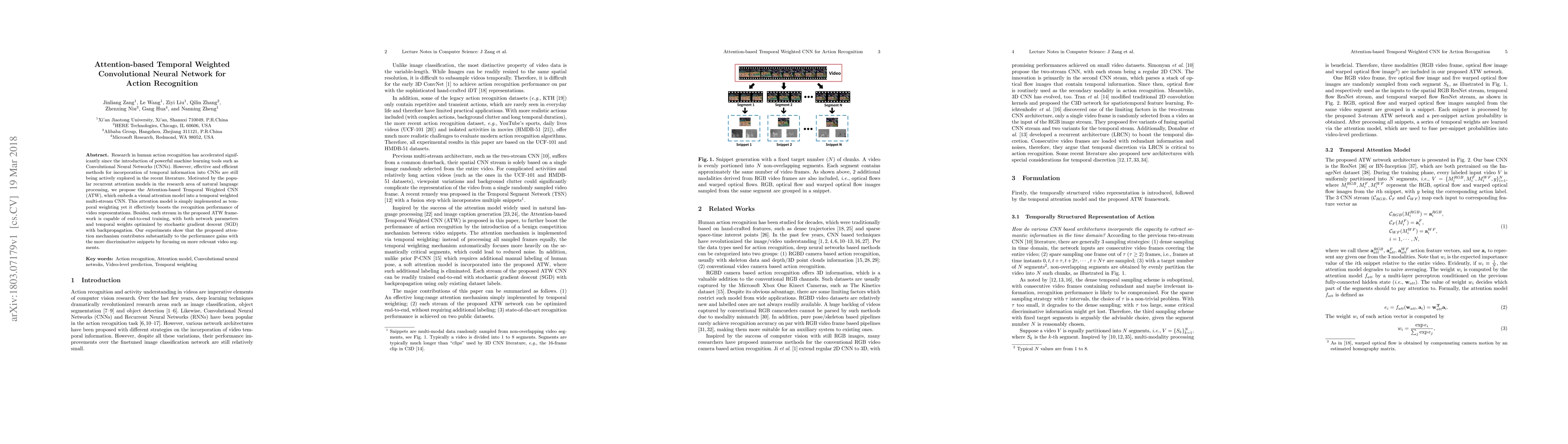 This paper proposes an Attention-based Temporal Weighted Convolutional Neural Network (ATW) for action recognition, integrating a visual attention model into a temporal weighted multi-stream CNN to enhance temporal information incorporation. The attention mechanism focuses on relevant video segments, substantially improving recognition performance.