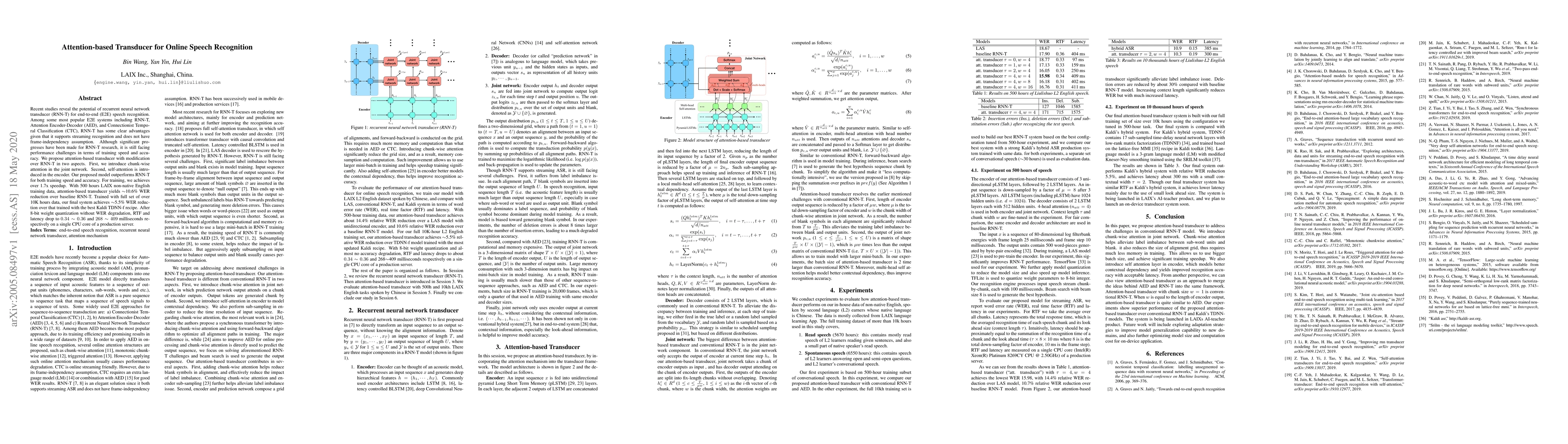 This paper proposes an attention-based transducer model that improves upon the recurrent neural network transducer (RNN-T) for online speech recognition. The model introduces chunk-wise attention and self-attention in the encoder, achieving a 1.7x speedup in training and a 10.6% reduction in word error rate (WER) on non-native English data.