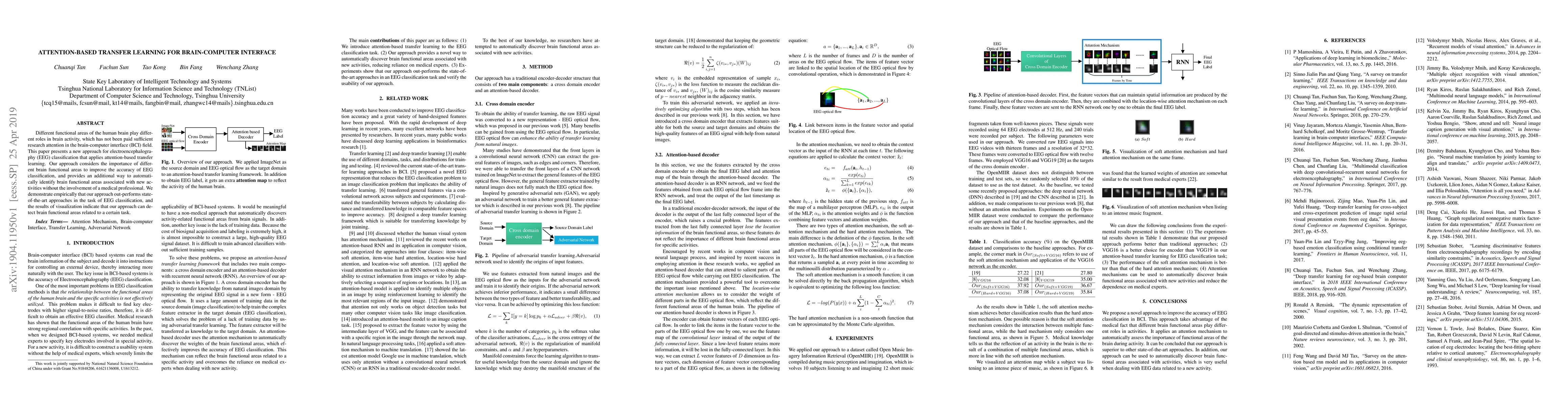 This paper introduces an attention-based transfer learning method for EEG classification in brain-computer interfaces, emphasizing different brain functional areas. It outperforms existing methods and can automatically identify brain regions associated with new activities, aiding in task-specific EEG analysis.