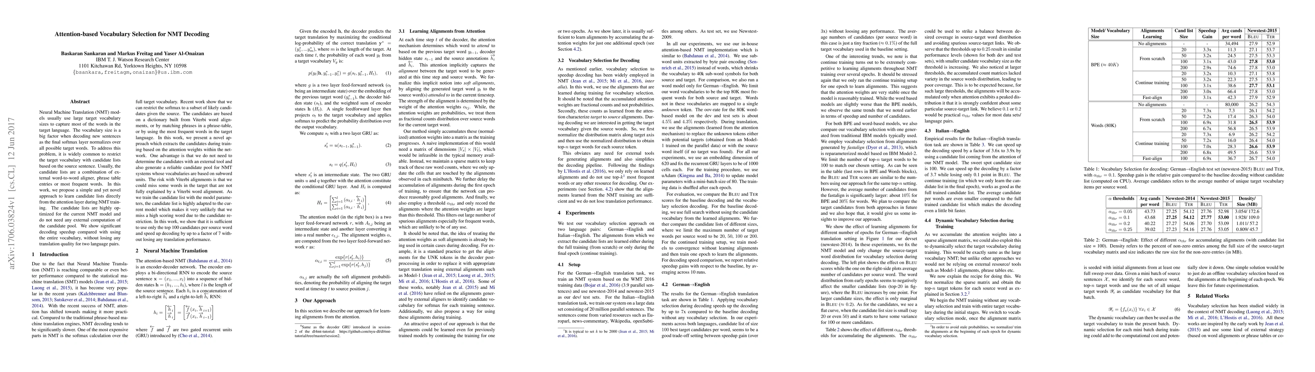 This paper proposes a method to select optimized vocabulary candidates during Neural Machine Translation (NMT) decoding by learning from the attention layer directly during training, achieving significant speedup without sacrificing translation quality for two language pairs.