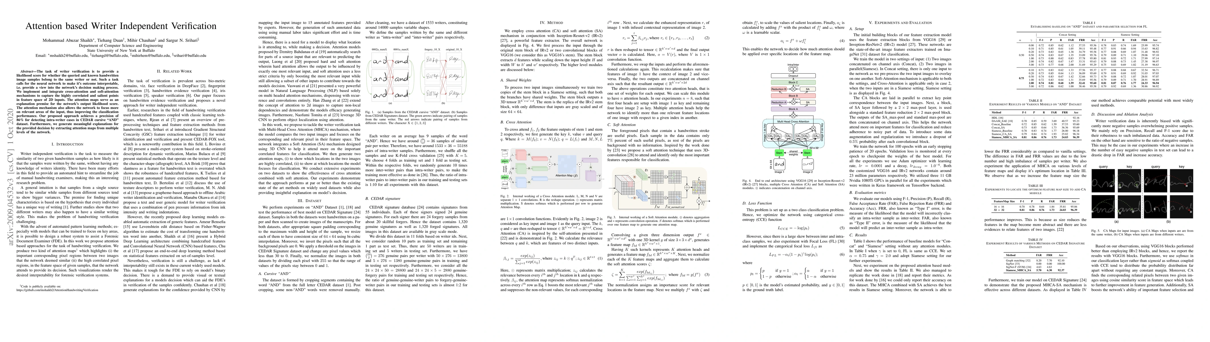 This paper proposes a neural network for writer verification using attention mechanisms to enhance interpretability and performance. The model employs cross-attention and soft-attention to focus on salient features, achieving 86% precision for intra-writer detection and providing attention maps for decision explanations.