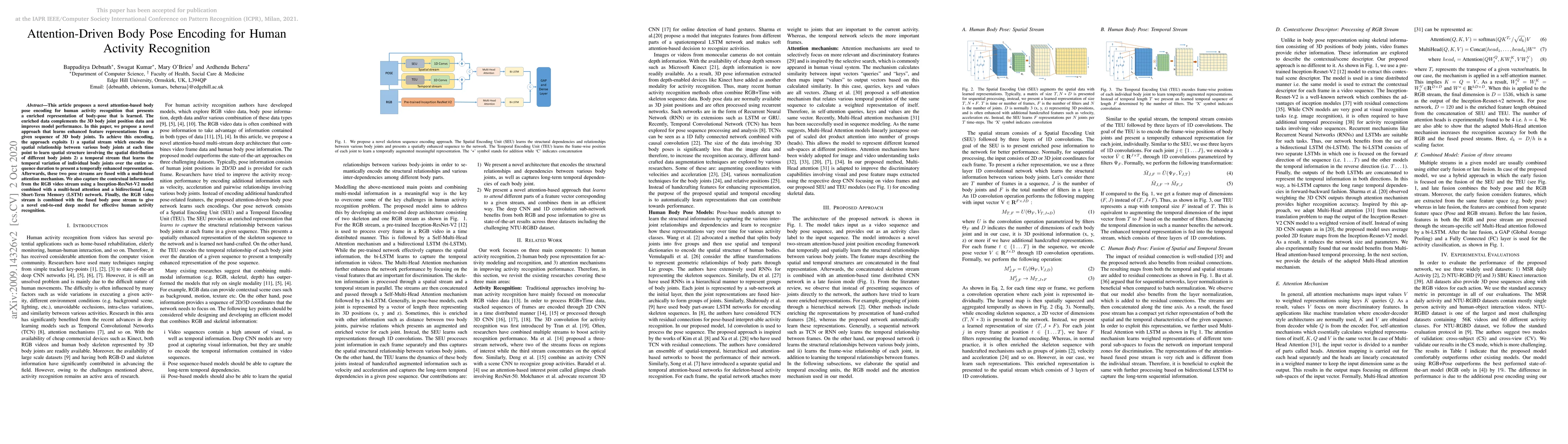 This paper introduces an attention-driven body pose encoding method for human activity recognition, combining spatial and temporal streams of 3D body joint data with a multi-head attention mechanism to enhance feature representation. It integrates RGB video context using an Inception-ResNet-V2 model and a bidirectional LSTM, achieving improved performance through the proposed end-to-end deep model.