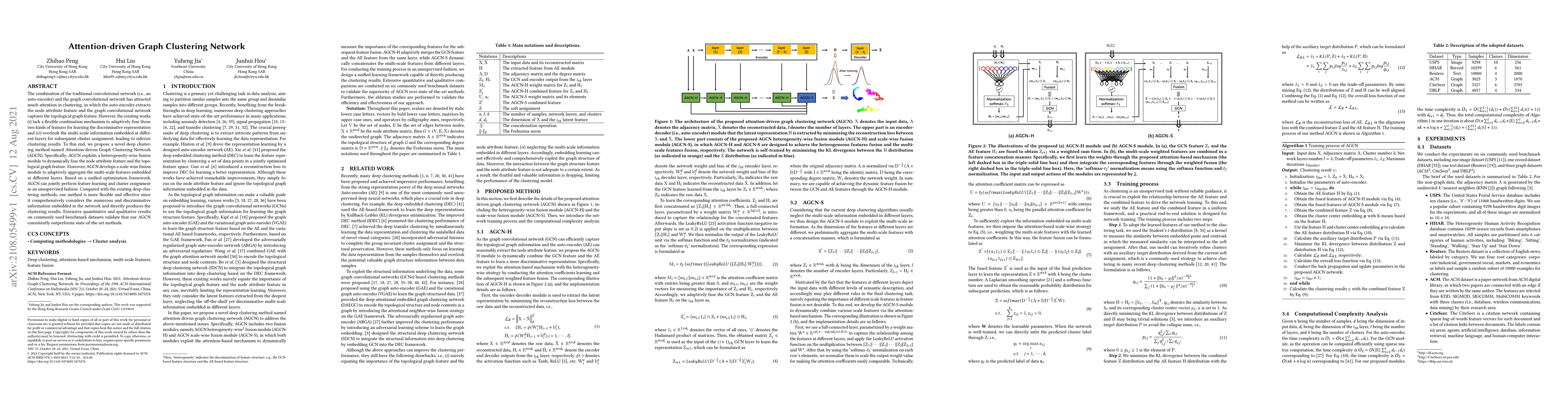 The combination of the traditional convolutional network (i.e., an auto-encoder) and the graph convolutional network has attracted much attention in clustering, in which the auto-encoder extracts the node attribute feature and the graph convolutional network captures the topological graph feature. However, the existing works (i) lack a flexible combination mechanism to adaptively fuse those two kinds of features for learning the discriminative representation and (ii) overlook the multi-scale information embedded at different layers for subsequent cluster assignment, leading to inferior clustering results. To this end, we propose a novel deep clustering method named Attention-driven Graph Clustering Network (AGCN). Specifically, AGCN exploits a heterogeneity-wise fusion module to dynamically fuse the node attribute feature and the topological graph feature. Moreover, AGCN develops a scale-wise fusion module to adaptively aggregate the multi-scale features embedded at different layers. Based on a unified optimization framework, AGCN can jointly perform feature learning and cluster assignment in an unsupervised fashion. Compared with the existing deep clustering methods, our method is more flexible and effective since it comprehensively considers the numerous and discriminative information embedded in the network and directly produces the clustering results. Extensive quantitative and qualitative results on commonly used benchmark datasets validate that our AGCN consistently outperforms state-of-the-art methods.