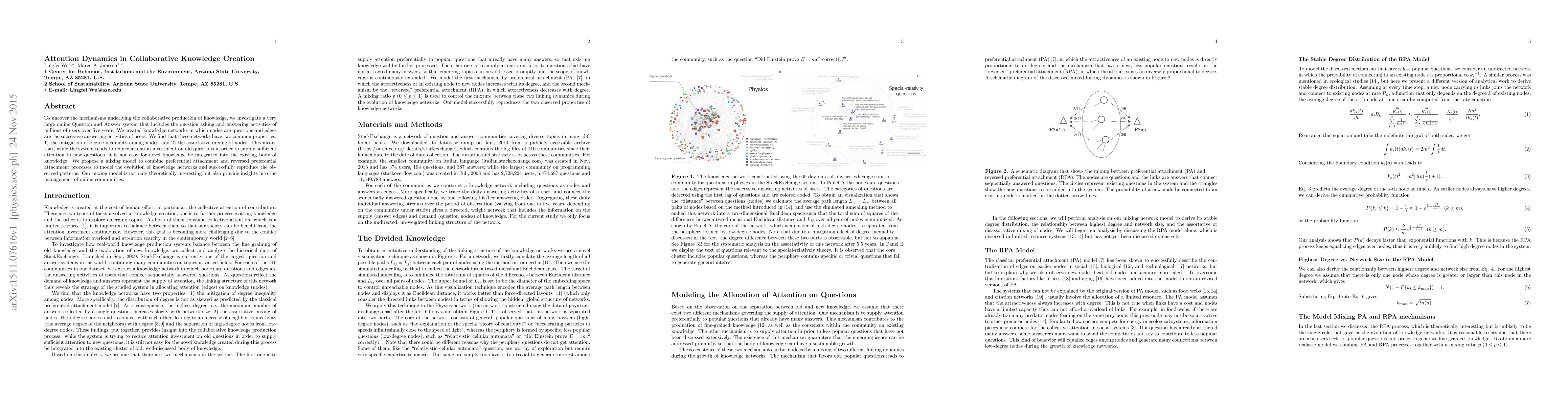 To uncover the mechanisms underlying the collaborative production of knowledge, we investigate a very large online Question and Answer system that includes the question asking and answering activities of millions of users over five years. We created knowledge networks in which nodes are questions and edges are the successive answering activities of users. We find that these networks have two common properties: 1) the mitigation of degree inequality among nodes; and 2) the assortative mixing of nodes. This means that, while the system tends to reduce attention investment on old questions in order to supply sufficient attention to new questions, it is not easy for novel knowledge be integrated into the existing body of knowledge. We propose a mixing model to combine preferential attachment and reversed preferential attachment processes to model the evolution of knowledge networks and successfully reproduce the ob- served patterns. Our mixing model is not only theoretically interesting but also provide insights into the management of online communities.