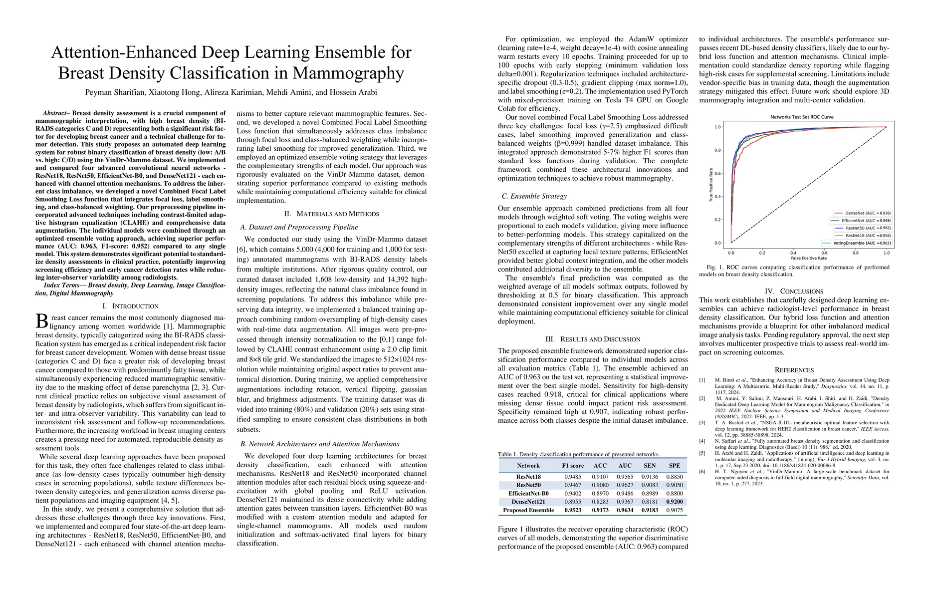 This research introduces an advanced deep learning system using attention mechanisms for classifying breast density in mammograms, achieving high accuracy (AUC: 0.963, F1-score: 0.952). The system combines four CNN models through an optimized ensemble method, addressing class imbalance with a novel loss function and preprocessing techniques, promising to enhance breast cancer screening and reduce radiologist variability.