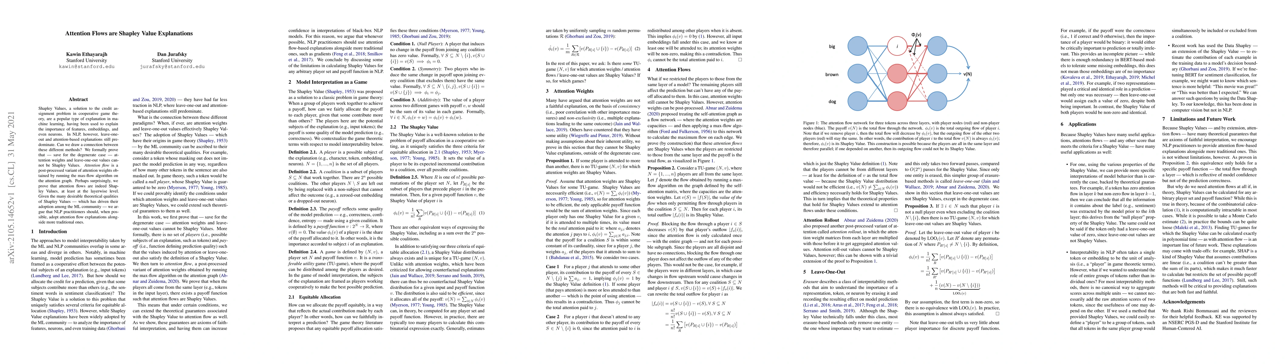 This paper demonstrates that attention flows, derived through a max-flow algorithm on the attention graph, are equivalent to Shapley Values, offering a theoretically robust explanation method in NLP. It contrasts this with traditional attention weights and leave-one-out explanations, advocating for their adoption due to the desirable properties of Shapley Values.
