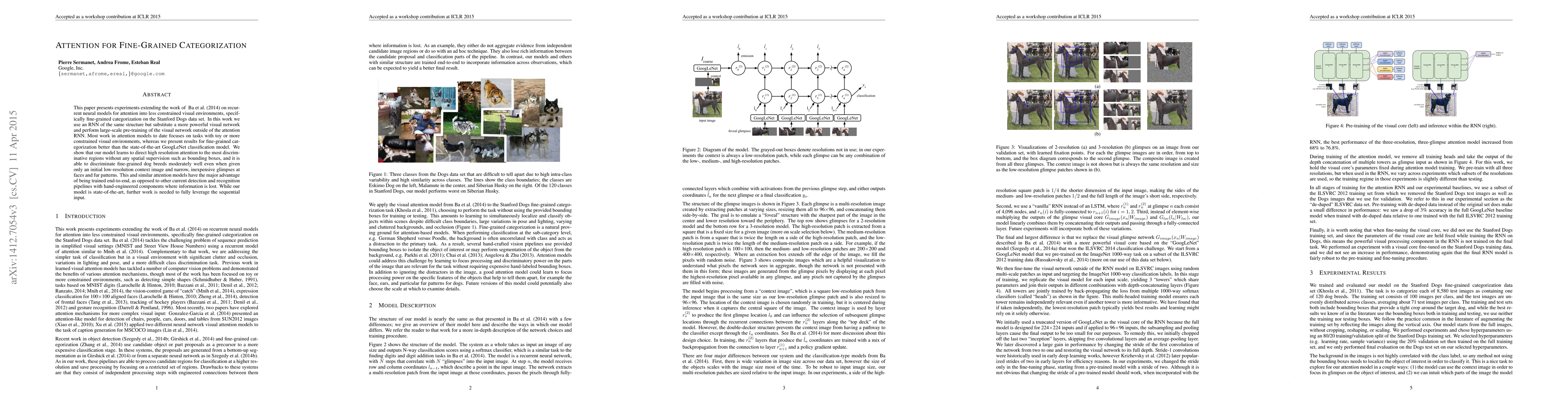 This paper presents experiments extending the work of Ba et al. (2014) on recurrent neural models for attention into less constrained visual environments, specifically fine-grained categorization on the Stanford Dogs data set. In this work we use an RNN of the same structure but substitute a more powerful visual network and perform large-scale pre-training of the visual network outside of the attention RNN. Most work in attention models to date focuses on tasks with toy or more constrained visual environments, whereas we present results for fine-grained categorization better than the state-of-the-art GoogLeNet classification model. We show that our model learns to direct high resolution attention to the most discriminative regions without any spatial supervision such as bounding boxes, and it is able to discriminate fine-grained dog breeds moderately well even when given only an initial low-resolution context image and narrow, inexpensive glimpses at faces and fur patterns. This and similar attention models have the major advantage of being trained end-to-end, as opposed to other current detection and recognition pipelines with hand-engineered components where information is lost. While our model is state-of-the-art, further work is needed to fully leverage the sequential input.