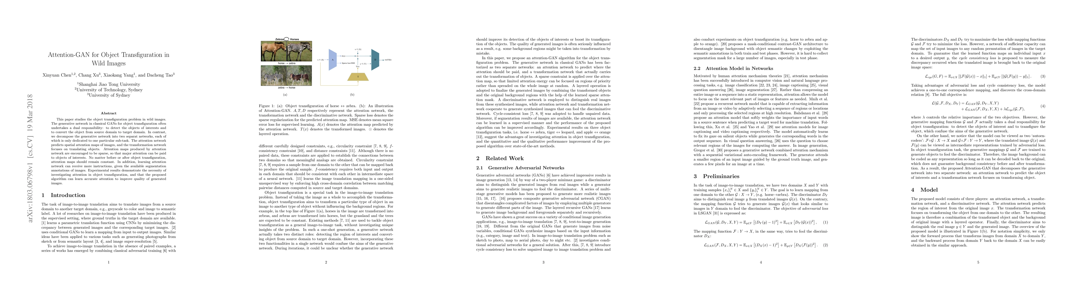 This paper studies the object transfiguration problem in wild images. The generative network in classical GANs for object transfiguration often undertakes a dual responsibility: to detect the objects of interests and to convert the object from source domain to target domain. In contrast, we decompose the generative network into two separat networks, each of which is only dedicated to one particular sub-task. The attention network predicts spatial attention maps of images, and the transformation network focuses on translating objects. Attention maps produced by attention network are encouraged to be sparse, so that major attention can be paid to objects of interests. No matter before or after object transfiguration, attention maps should remain constant. In addition, learning attention network can receive more instructions, given the available segmentation annotations of images. Experimental results demonstrate the necessity of investigating attention in object transfiguration, and that the proposed algorithm can learn accurate attention to improve quality of generated images.