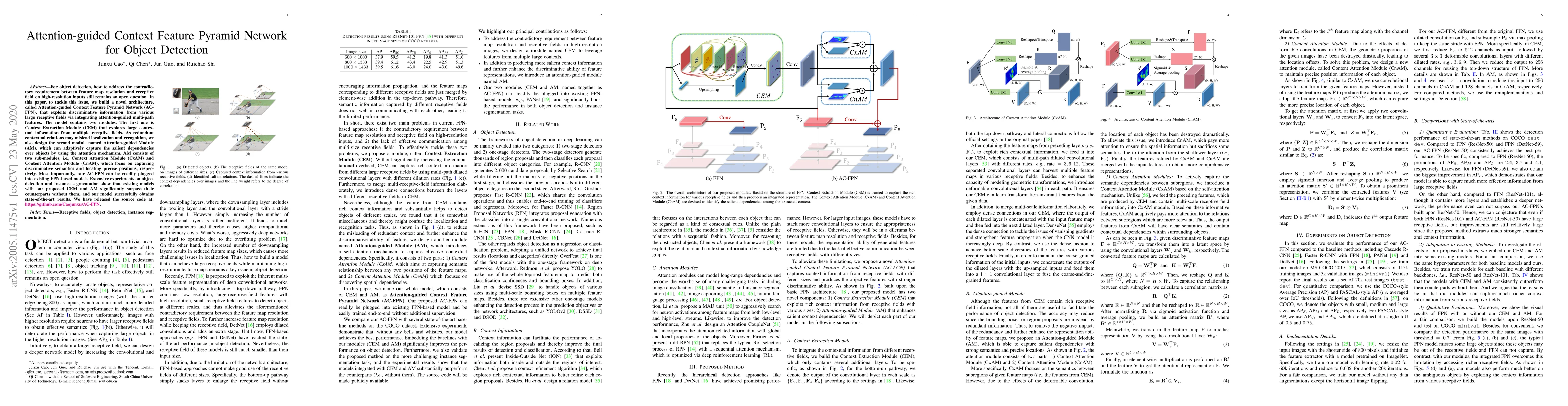 This paper proposes an Attention-guided Context Feature Pyramid Network (AC-FPN) to enhance object detection by balancing feature map resolution and receptive field. The AC-FPN integrates attention mechanisms to adaptively capture salient features, achieving state-of-the-art results in object detection and instance segmentation.