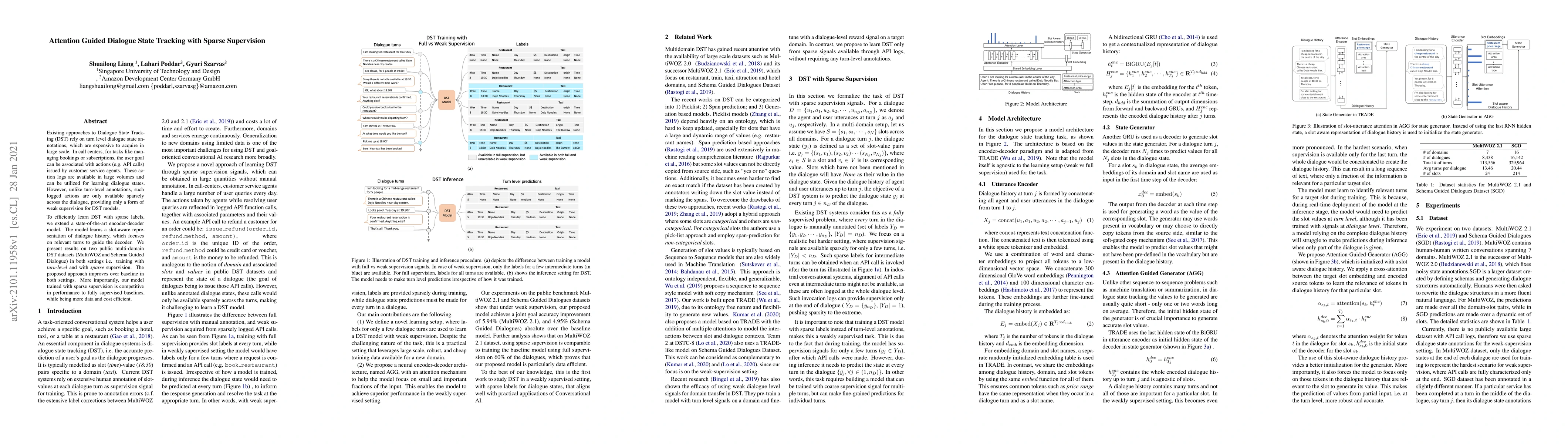 This paper proposes an attention-guided model for Dialogue State Tracking (DST) that leverages sparse supervision from action logs instead of expensive turn-level annotations. The model effectively learns slot-aware dialogue history representations, achieving competitive performance with sparse supervision compared to fully supervised baselines.