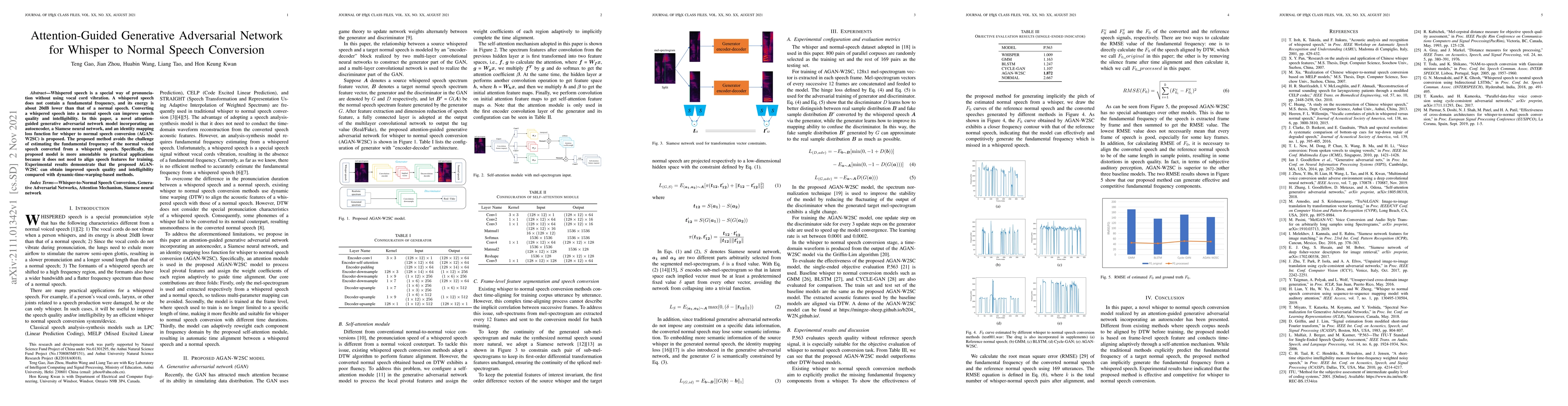 This paper proposes an attention-guided generative adversarial network (AGAN-W2SC) for converting whispered speech to normal speech, enhancing quality and intelligibility. The model avoids estimating fundamental frequency and does not require feature alignment, showing superior results compared to dynamic-time-warping-based methods.