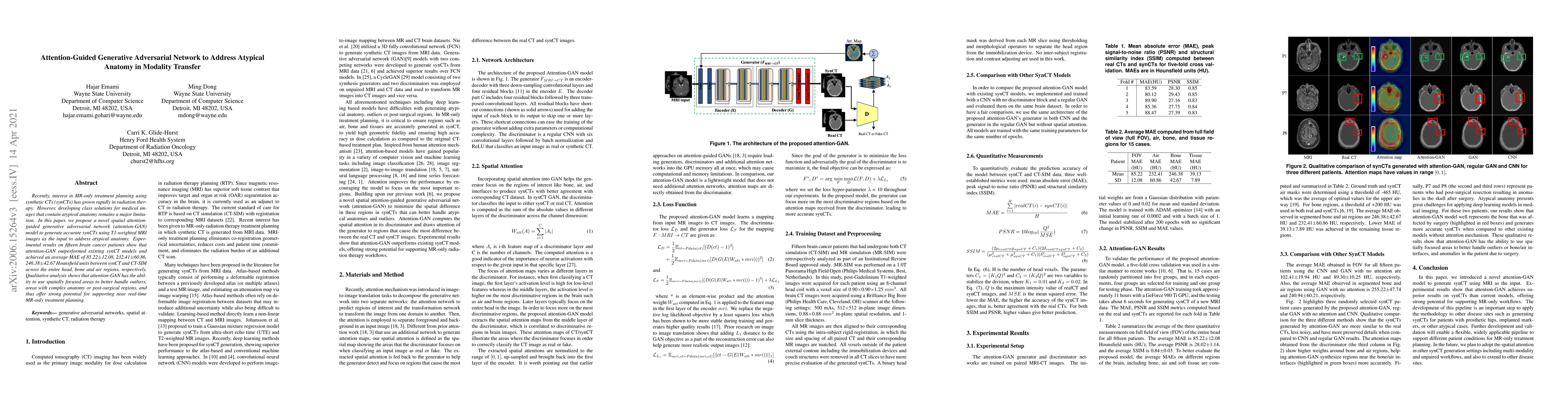 This research introduces an attention-guided Generative Adversarial Network (attention-GAN) to create accurate synthetic CT (synCT) images from T1-weighted MRI, addressing atypical anatomy in radiation therapy. Experiments on brain cancer patients showed improved performance with an average MAE of 85.22±12.08, 232.41±60.86, 246.38±42.67 Hounsfield units for whole head, bone, and air regions, respectively. The model demonstrates potential for real-time MR-only treatment planning, especially in complex or post-surgical areas.