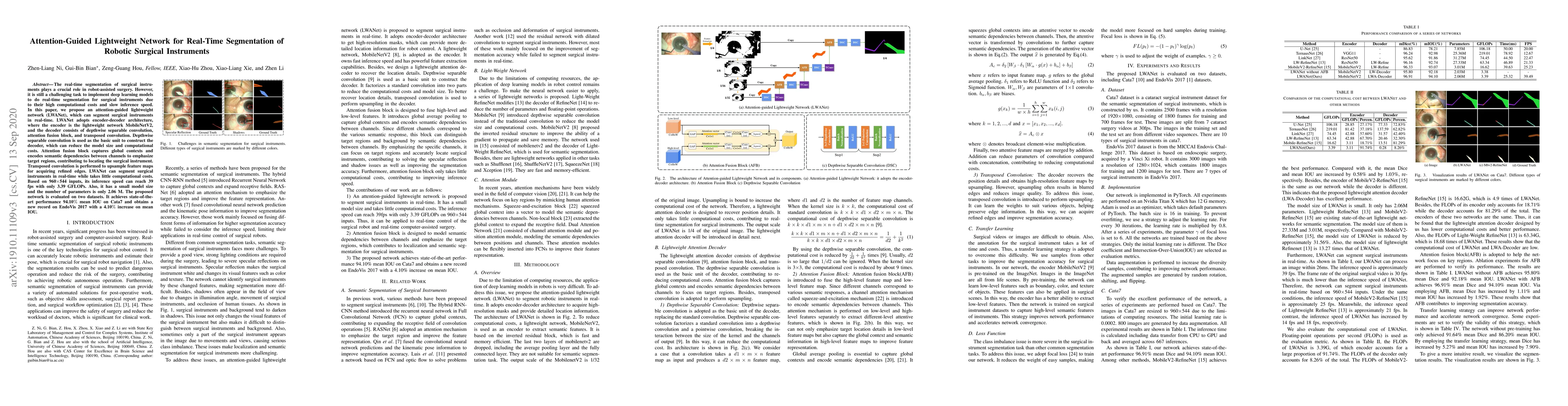This paper proposes an attention-guided lightweight network (LWANet) for real-time segmentation of robotic surgical instruments, utilizing MobileNetV2 and depthwise separable convolutions to reduce computational costs while achieving high inference speed and accuracy. LWANet achieves 39 fps with 3.39 GFLOPs and 2.06 M parameters, outperforming other methods with 94.10% mean IOU on Cata7 and a 4.10% increase on EndoVis 2017.