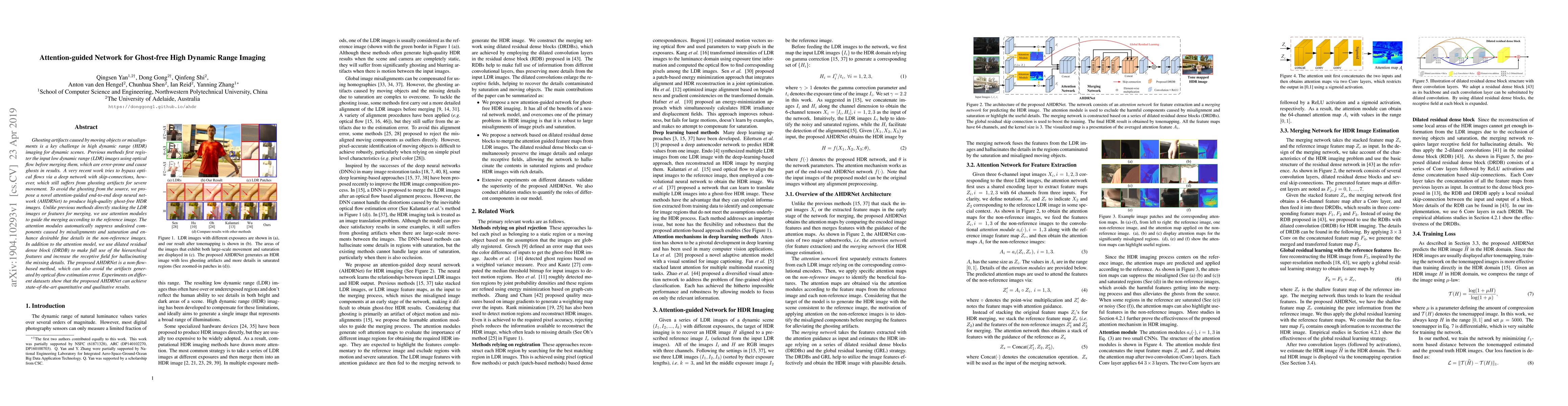 The paper proposes an attention-guided end-to-end deep neural network (AHDRNet) to produce ghost-free high dynamic range (HDR) images by suppressing misalignments and enhancing fine details without relying on optical flow. The method uses attention modules and dilated residual dense blocks to achieve state-of-the-art results in ghosting artifact reduction.