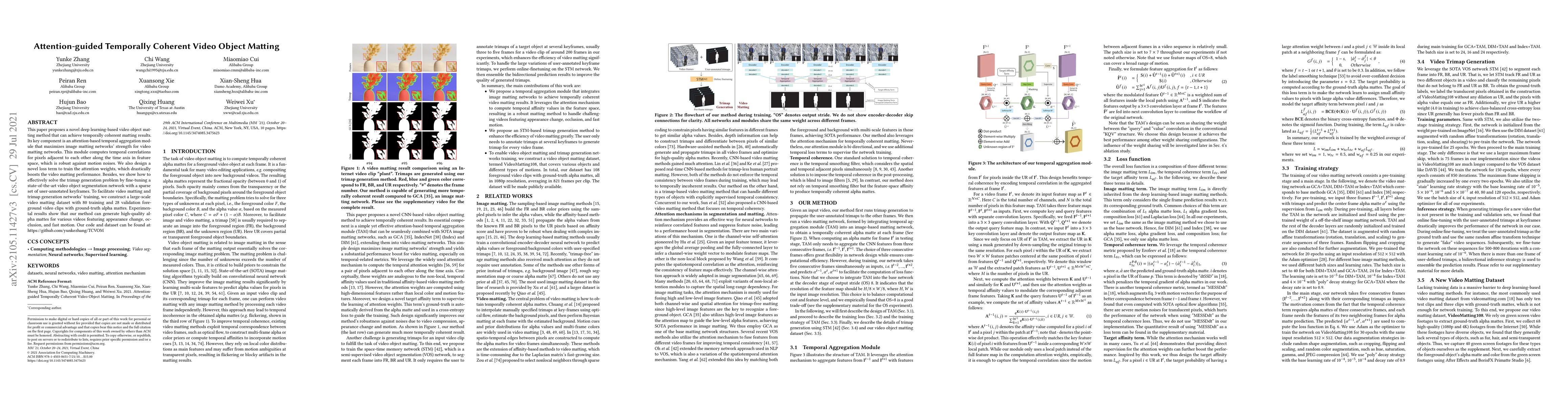 This paper introduces a deep learning method for temporally coherent video object matting, utilizing an attention-based temporal aggregation module to enhance matting performance and a novel loss term for training. It also addresses trimap generation through fine-tuning a segmentation network, and provides a new dataset for training and evaluation.