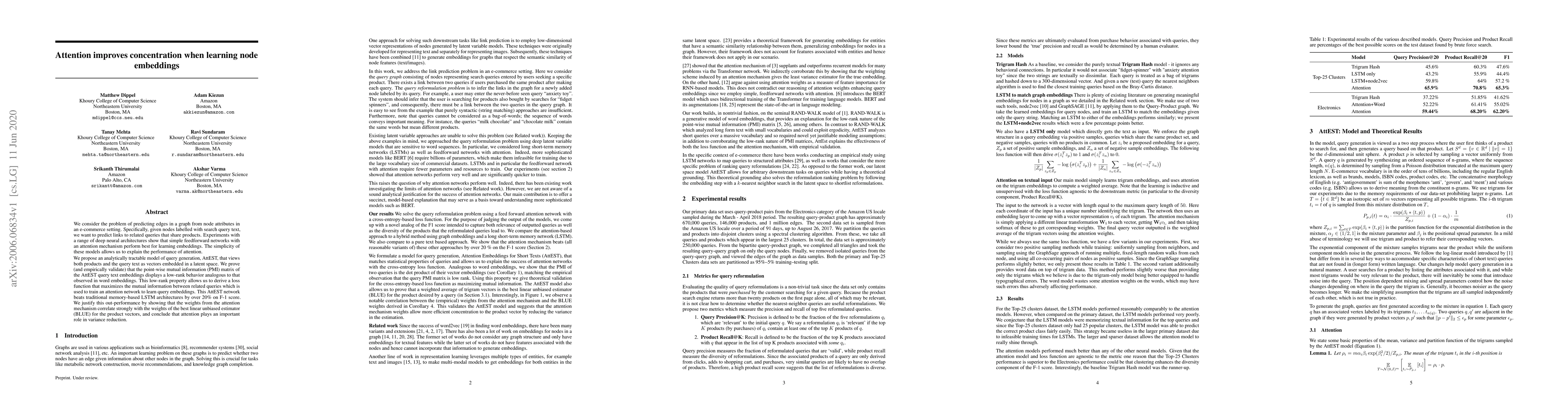 We consider the problem of predicting edges in a graph from node attributes in an e-commerce setting. Specifically, given nodes labelled with search query text, we want to predict links to related queries that share products. Experiments with a range of deep neural architectures show that simple feedforward networks with an attention mechanism perform best for learning embeddings. The simplicity of these models allows us to explain the performance of attention. We propose an analytically tractable model of query generation, AttEST, that views both products and the query text as vectors embedded in a latent space. We prove (and empirically validate) that the point-wise mutual information (PMI) matrix of the AttEST query text embeddings displays a low-rank behavior analogous to that observed in word embeddings. This low-rank property allows us to derive a loss function that maximizes the mutual information between related queries which is used to train an attention network to learn query embeddings. This AttEST network beats traditional memory-based LSTM architectures by over 20% on F-1 score. We justify this out-performance by showing that the weights from the attention mechanism correlate strongly with the weights of the best linear unbiased estimator (BLUE) for the product vectors, and conclude that attention plays an important role in variance reduction.
