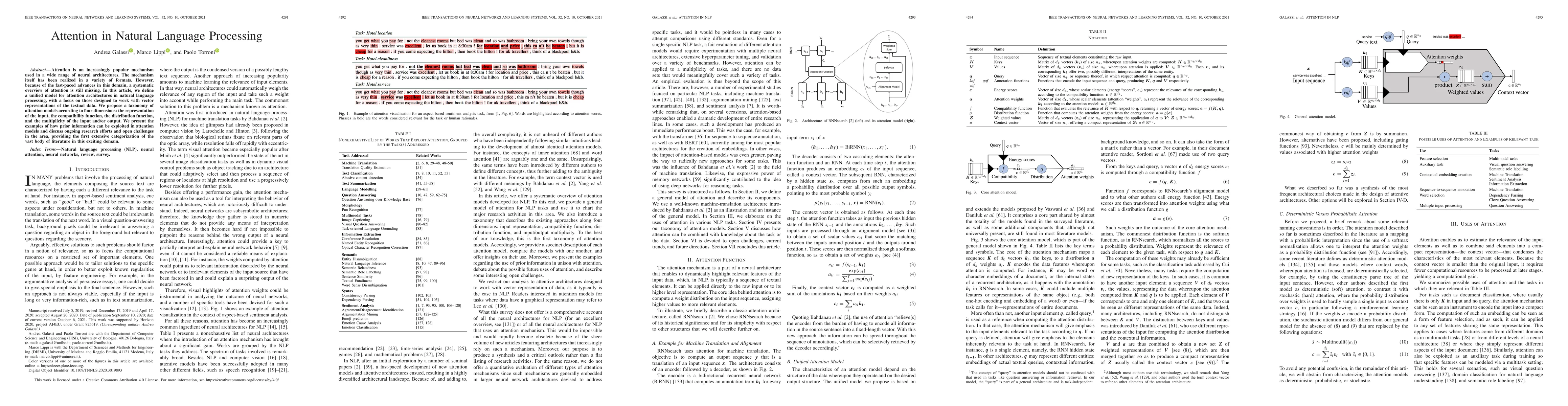 Attention is an increasingly popular mechanism used in a wide range of neural architectures. The mechanism itself has been realized in a variety of formats. However, because of the fast-paced advances in this domain, a systematic overview of attention is still missing. In this article, we define a unified model for attention architectures in natural language processing, with a focus on those designed to work with vector representations of the textual data. We propose a taxonomy of attention models according to four dimensions: the representation of the input, the compatibility function, the distribution function, and the multiplicity of the input and/or output. We present the examples of how prior information can be exploited in attention models and discuss ongoing research efforts and open challenges in the area, providing the first extensive categorization of the vast body of literature in this exciting domain.