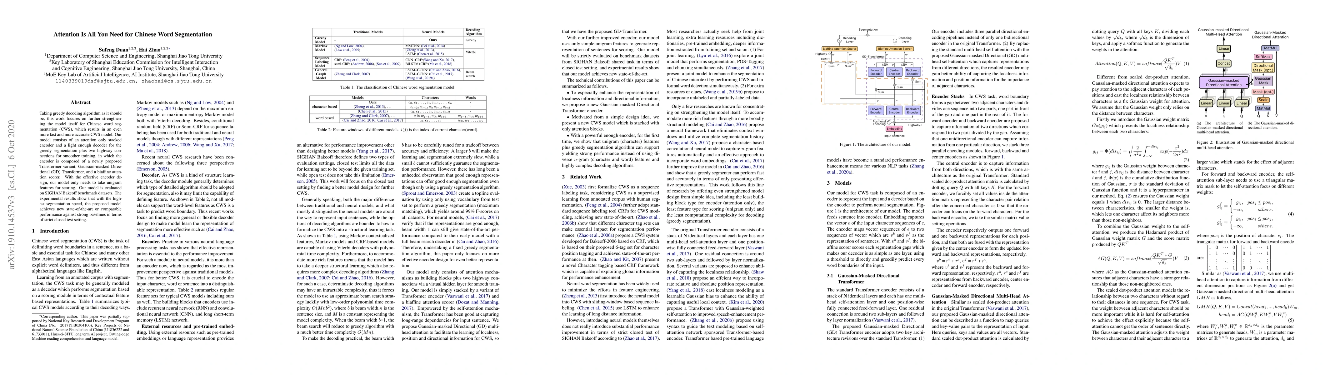 This paper proposes a Transformer-based model with an attention-only stacked encoder and a lightweight decoder for Chinese Word Segmentation (CWS). The model, featuring a Gaussian-masked Directional Transformer and biaffine attention, achieves state-of-the-art performance and the highest segmentation speed on benchmark datasets.