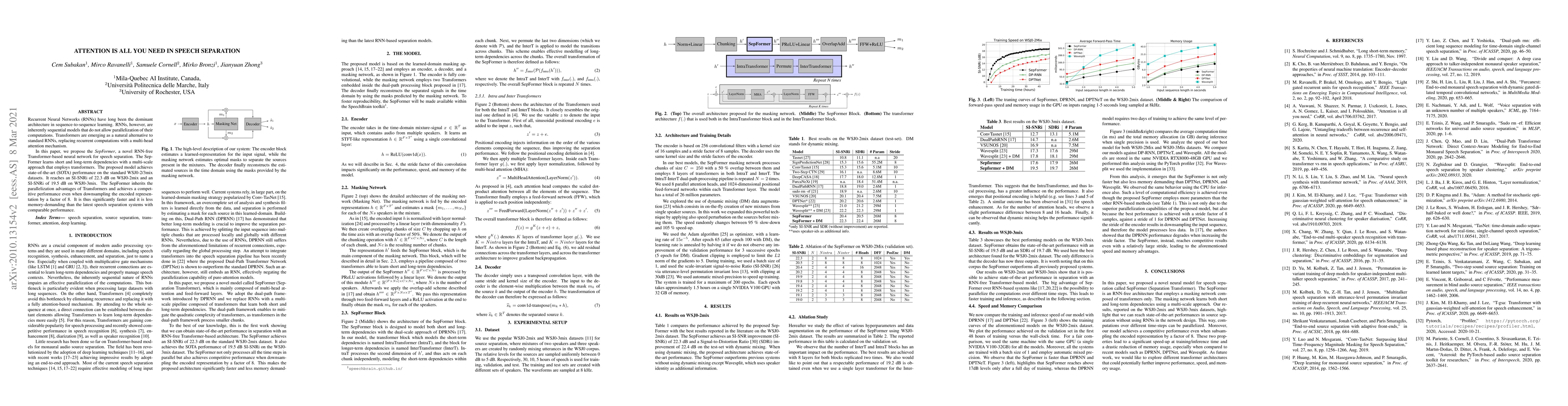 This paper introduces SepFormer, a Transformer-based model for speech separation, achieving state-of-the-art performance on WSJ0-2/3mix datasets while leveraging the parallelization benefits of Transformers for faster and more efficient processing.