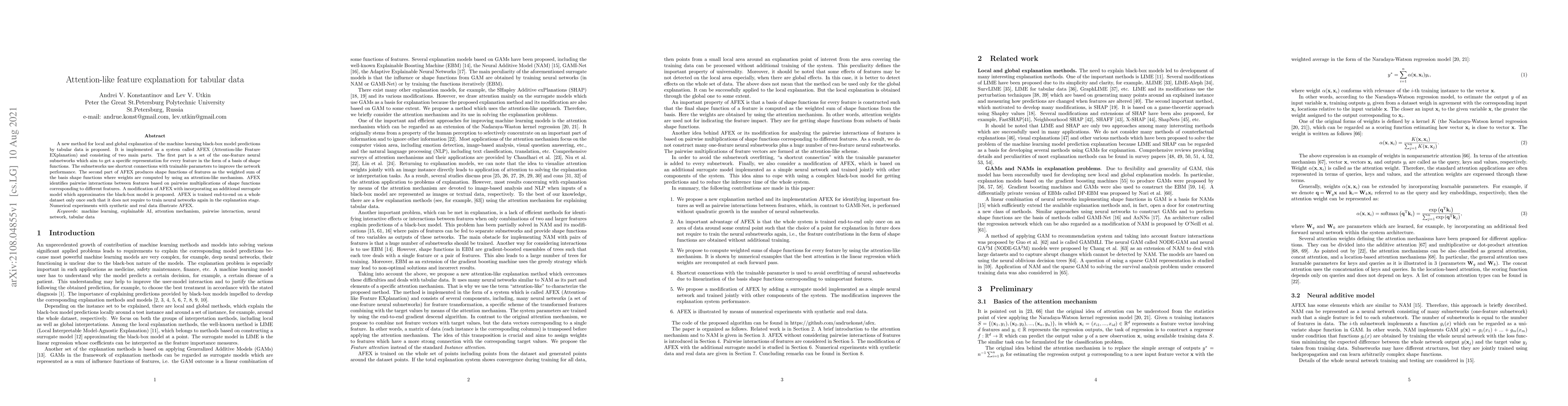 A new method for local and global explanation of the machine learning black-box model predictions by tabular data is proposed. It is implemented as a system called AFEX (Attention-like Feature EXplanation) and consisting of two main parts. The first part is a set of the one-feature neural subnetworks which aim to get a specific representation for every feature in the form of a basis of shape functions. The subnetworks use shortcut connections with trainable parameters to improve the network performance. The second part of AFEX produces shape functions of features as the weighted sum of the basis shape functions where weights are computed by using an attention-like mechanism. AFEX identifies pairwise interactions between features based on pairwise multiplications of shape functions corresponding to different features. A modification of AFEX with incorporating an additional surrogate model which approximates the black-box model is proposed. AFEX is trained end-to-end on a whole dataset only once such that it does not require to train neural networks again in the explanation stage. Numerical experiments with synthetic and real data illustrate AFEX.