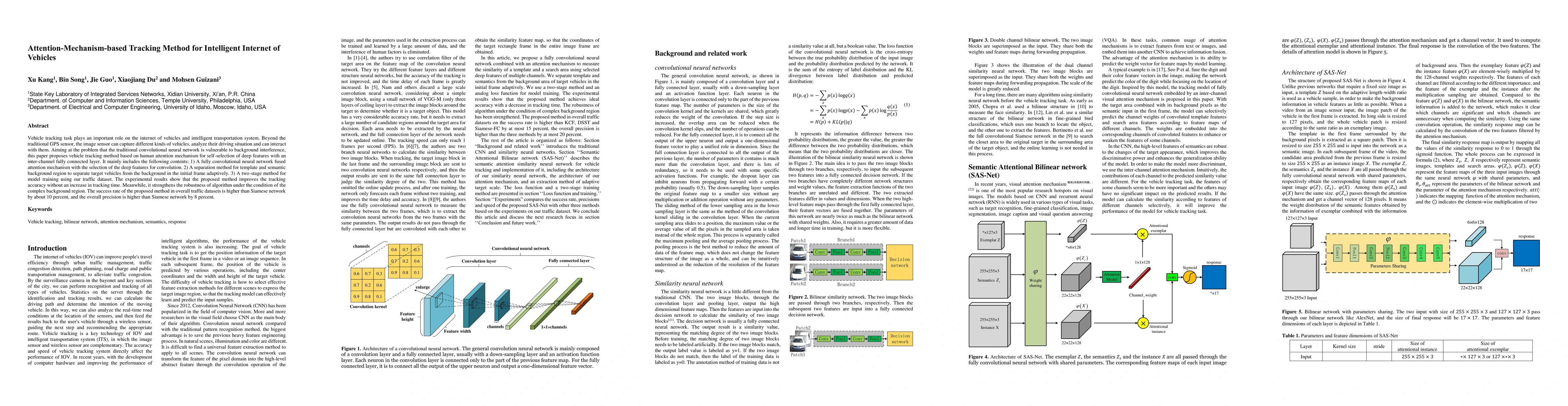 This paper proposes an attention-mechanism-based tracking method for intelligent Internet of Vehicles, utilizing a fully convolutional neural network with an inter-channel fully connected layer to enhance feature selection and robustness against background interference. The method outperforms traditional Siamese networks in tracking accuracy and precision by about 10% and 8% respectively, without increasing tracking time.