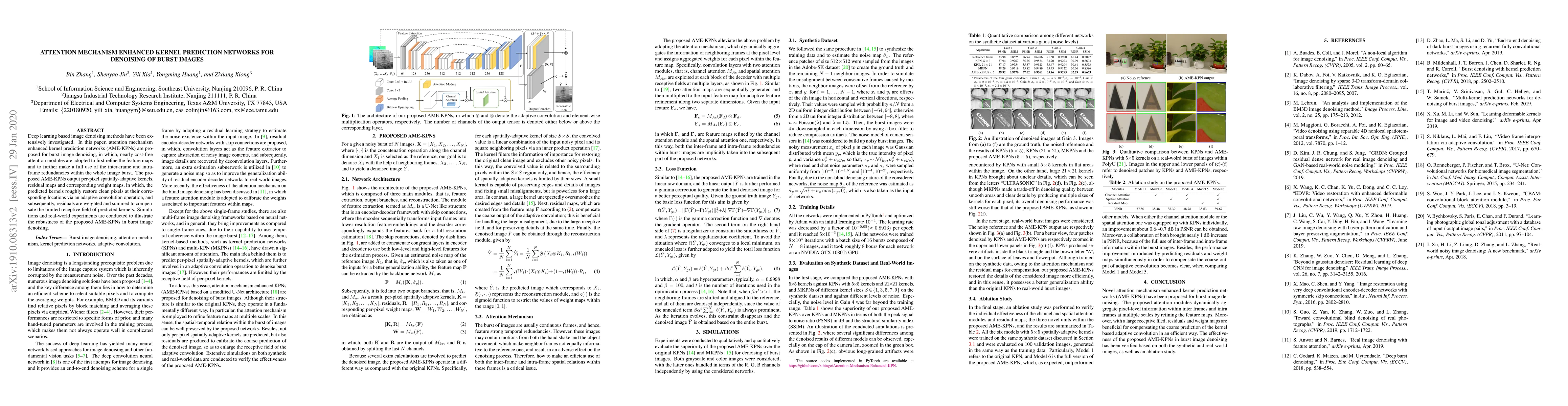 This paper proposes AME-KPNs for burst image denoising, a deep learning method that refines feature maps with attention modules to restore clean pixels through adaptive convolution and residual compensation. The approach shows robustness in simulating and real-world experiments.