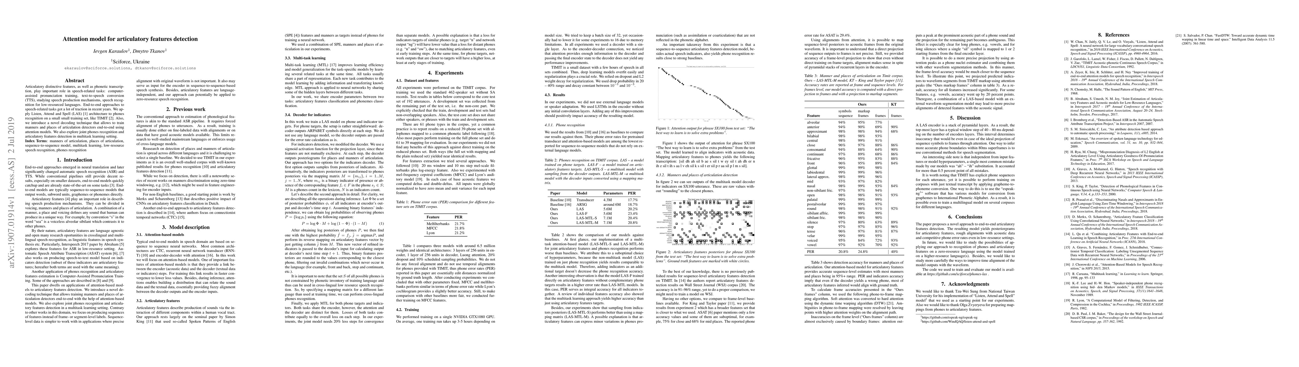 The paper proposes an attention-based model to detect articulatory features for tasks such as pronunciation training and TTS, applying the Listen, Attend and Spell architecture on a small dataset. It introduces a novel decoding technique for end-to-end detection of articulation manners and places, and explores their joint recognition in a multitask learning framework.