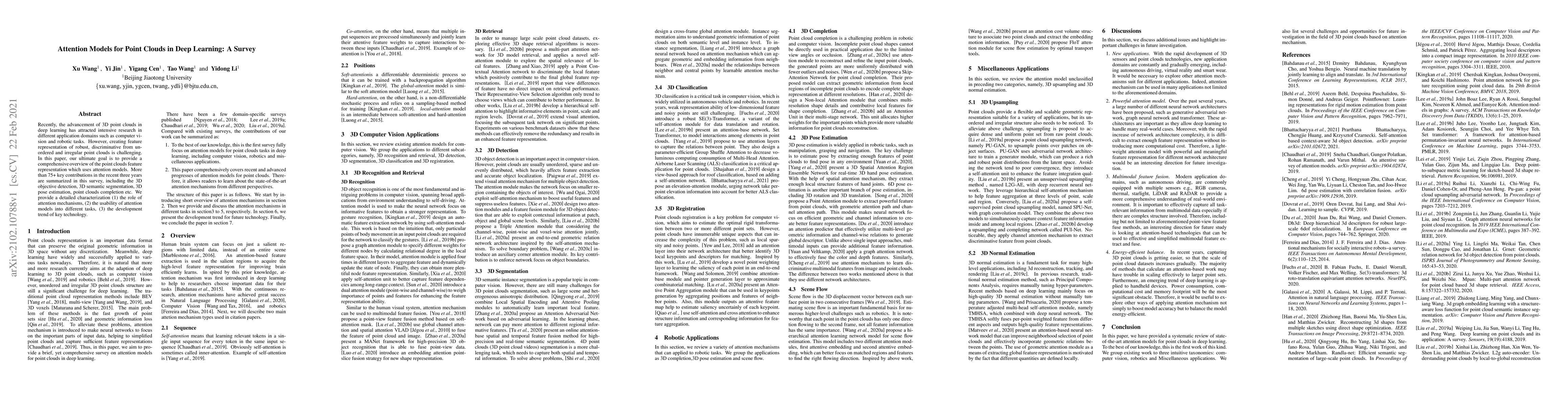 Recently, the advancement of 3D point clouds in deep learning has attracted intensive research in different application domains such as computer vision and robotic tasks. However, creating feature representation of robust, discriminative from unordered and irregular point clouds is challenging. In this paper, our ultimate goal is to provide a comprehensive overview of the point clouds feature representation which uses attention models. More than 75+ key contributions in the recent three years are summarized in this survey, including the 3D objective detection, 3D semantic segmentation, 3D pose estimation, point clouds completion etc. We provide a detailed characterization (1) the role of attention mechanisms, (2) the usability of attention models into different tasks, (3) the development trend of key technology.