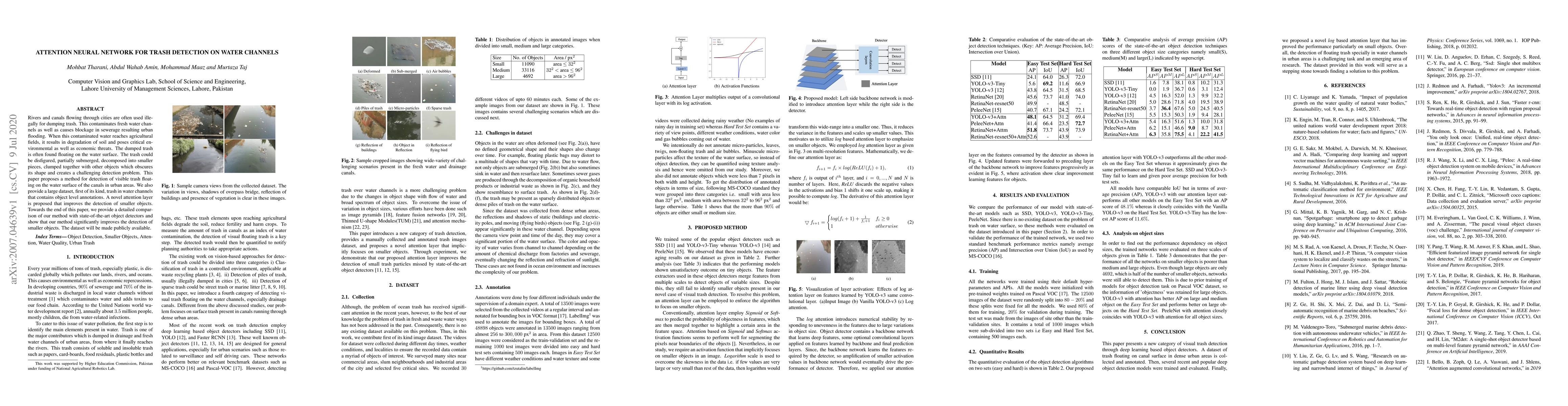 Rivers and canals flowing through cities are often used illegally for dumping the trash. This contaminates freshwater channels as well as causes blockage in sewerage resulting in urban flooding. When this contaminated water reaches agricultural fields, it results in degradation of soil and poses critical environmental as well as economic threats. The dumped trash is often found floating on the water surface. The trash could be disfigured, partially submerged, decomposed into smaller pieces, clumped together with other objects which obscure its shape and creates a challenging detection problem. This paper proposes a method for the detection of visible trash floating on the water surface of the canals in urban areas. We also provide a large dataset, first of its kind, trash in water channels that contains object-level annotations. A novel attention layer is proposed that improves the detection of smaller objects. Towards the end of this paper, we provide a detailed comparison of our method with state-of-the-art object detectors and show that our method significantly improves the detection of smaller objects. The dataset will be made publicly available.