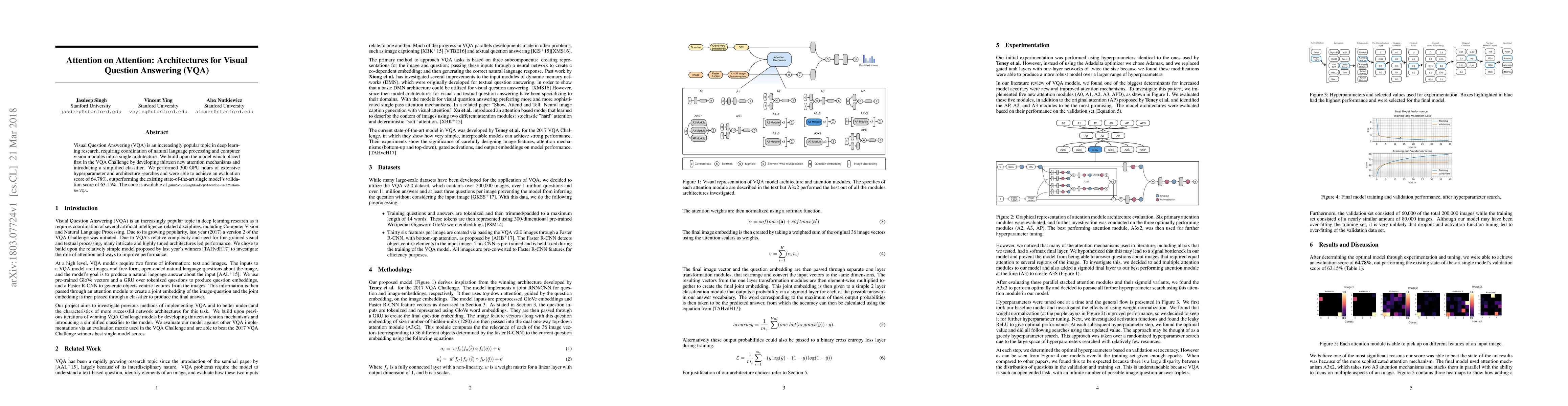Visual Question Answering (VQA) is an increasingly popular topic in deep learning research, requiring coordination of natural language processing and computer vision modules into a single architecture. We build upon the model which placed first in the VQA Challenge by developing thirteen new attention mechanisms and introducing a simplified classifier. We performed 300 GPU hours of extensive hyperparameter and architecture searches and were able to achieve an evaluation score of 64.78%, outperforming the existing state-of-the-art single model's validation score of 63.15%.