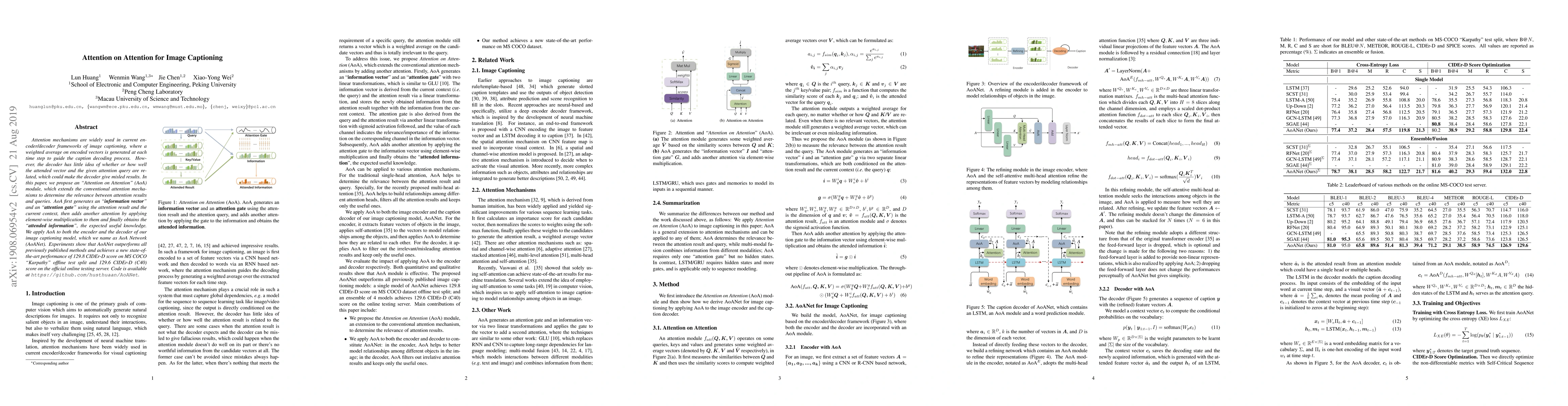 This paper introduces an Attention on Attention (AoA) module to enhance image captioning by determining the relevance between attended vectors and queries, achieving state-of-the-art performance with a new CIDEr-D score of 129.8 on MS COCO. The AoANet model applies AoA in both encoder and decoder, improving caption accuracy.