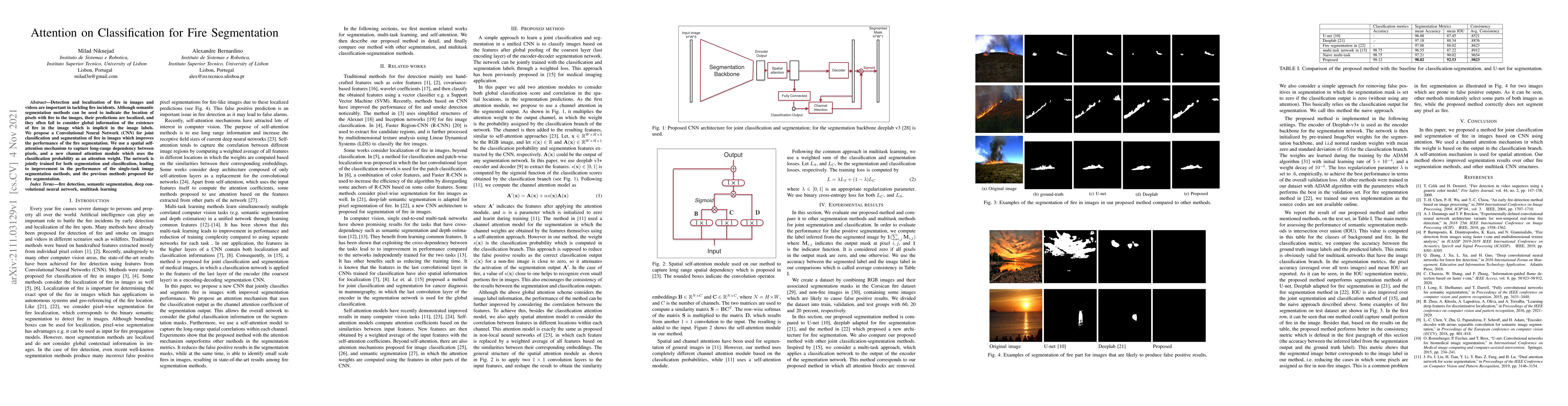The network jointly trains for both segmentation and classification, leading to better results than previous methods proposed for fire segmentation.