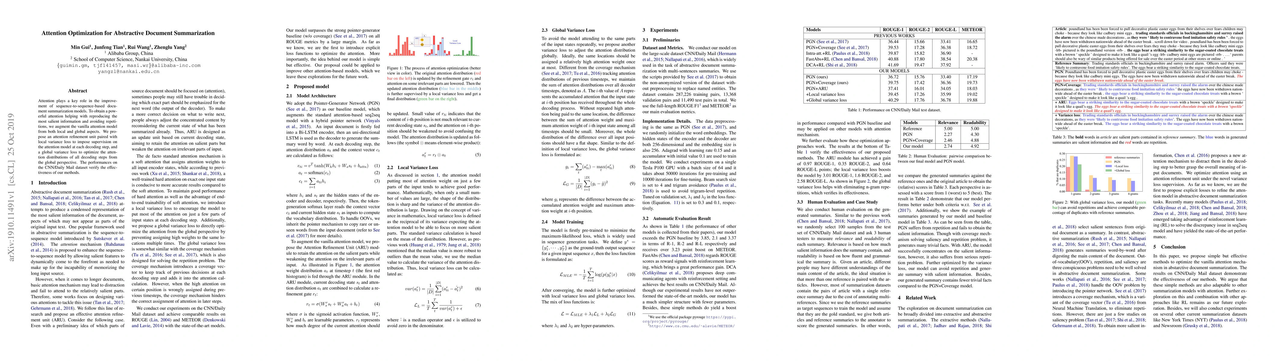 This paper proposes enhanced attention mechanisms for abstractive document summarization, incorporating local and global variance losses to refine attention and reduce repetitions. Experimental results on the CNN/Daily Mail dataset demonstrate the effectiveness of the proposed approach.