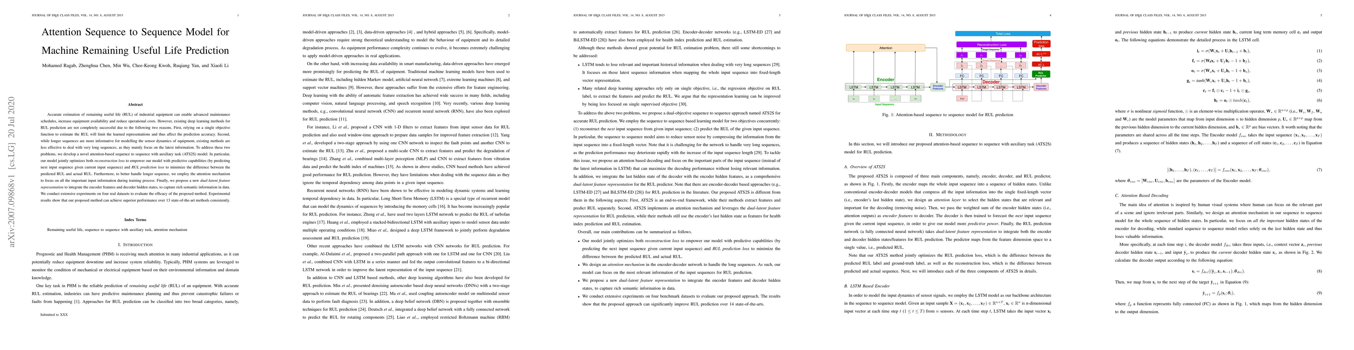 This paper proposes an attention-based sequence to sequence model with an auxiliary task (ATS2S) for accurate remaining useful life (RUL) prediction of industrial equipment. The model addresses limitations of existing methods by jointly optimizing reconstruction and RUL prediction losses, employing an attention mechanism for handling long sequences, and introducing a dual-latent feature representation. Experimental results demonstrate superior performance over 13 state-of-the-art methods across four datasets.
