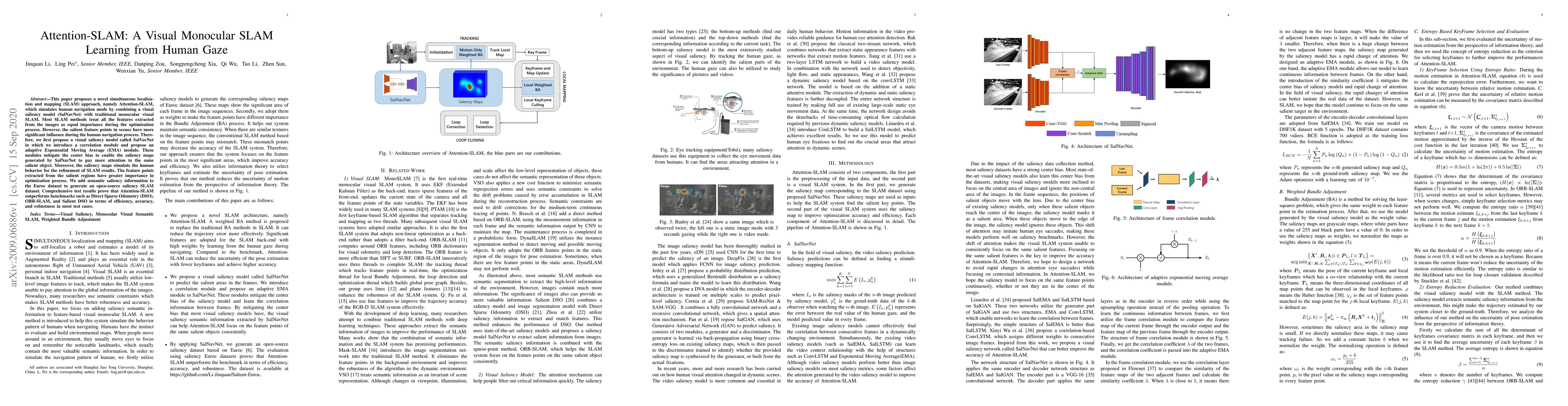 This paper proposes Attention-SLAM, a novel monocular SLAM method that integrates human gaze behavior through a visual saliency model, SalNavNet, to prioritize salient features, improving efficiency, accuracy, and robustness compared to traditional SLAM methods. The approach outperforms benchmarks like DSO and ORB-SLAM in various tests.