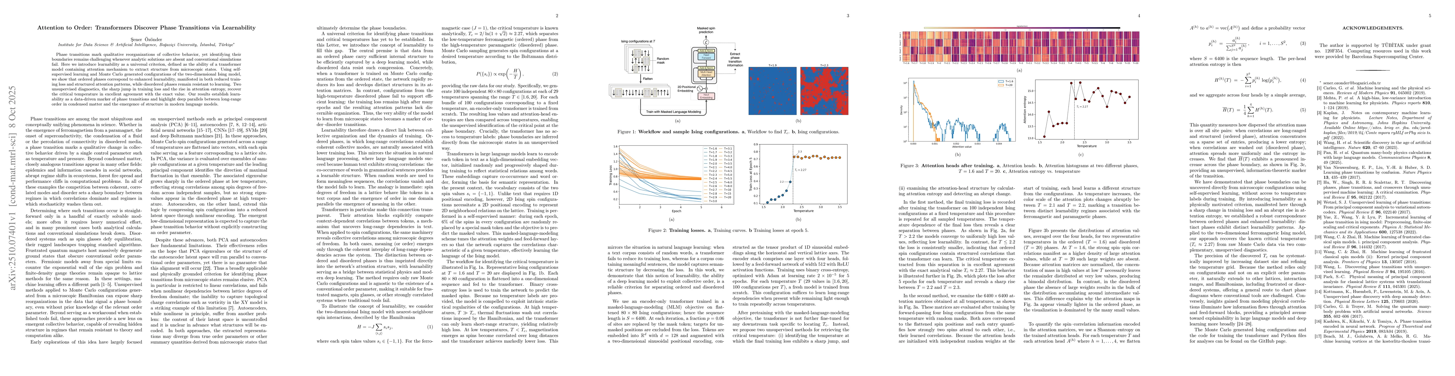 Phase transitions mark qualitative reorganizations of collective behavior, yet identifying their boundaries remains challenging whenever analytic solutions are absent and conventional simulations fail. Here we introduce learnability as a universal criterion, defined as the ability of a transformer model containing attention mechanism to extract structure from microscopic states. Using self-supervised learning and Monte Carlo generated configurations of the two-dimensional Ising model, we show that ordered phases correspond to enhanced learnability, manifested in both reduced training loss and structured attention patterns, while disordered phases remain resistant to learning. Two unsupervised diagnostics, the sharp jump in training loss and the rise in attention entropy, recover the critical temperature in excellent agreement with the exact value. Our results establish learnability as a data-driven marker of phase transitions and highlight deep parallels between long-range order in condensed matter and the emergence of structure in modern language models.