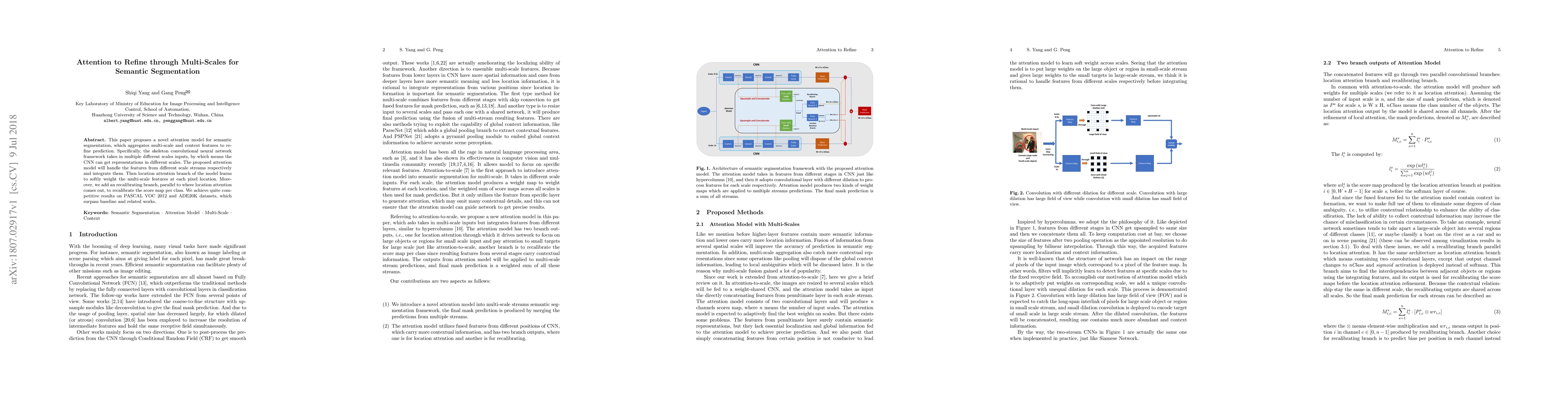 This paper proposes a novel attention model for semantic segmentation, which aggregates multi-scale and context features to refine prediction. Specifically, the skeleton convolutional neural network framework takes in multiple different scales inputs, by which means the CNN can get representations in different scales. The proposed attention model will handle the features from different scale streams respectively and integrate them. Then location attention branch of the model learns to softly weight the multi-scale features at each pixel location. Moreover, we add an recalibrating branch, parallel to where location attention comes out, to recalibrate the score map per class. We achieve quite competitive results on PASCAL VOC 2012 and ADE20K datasets, which surpass baseline and related works.