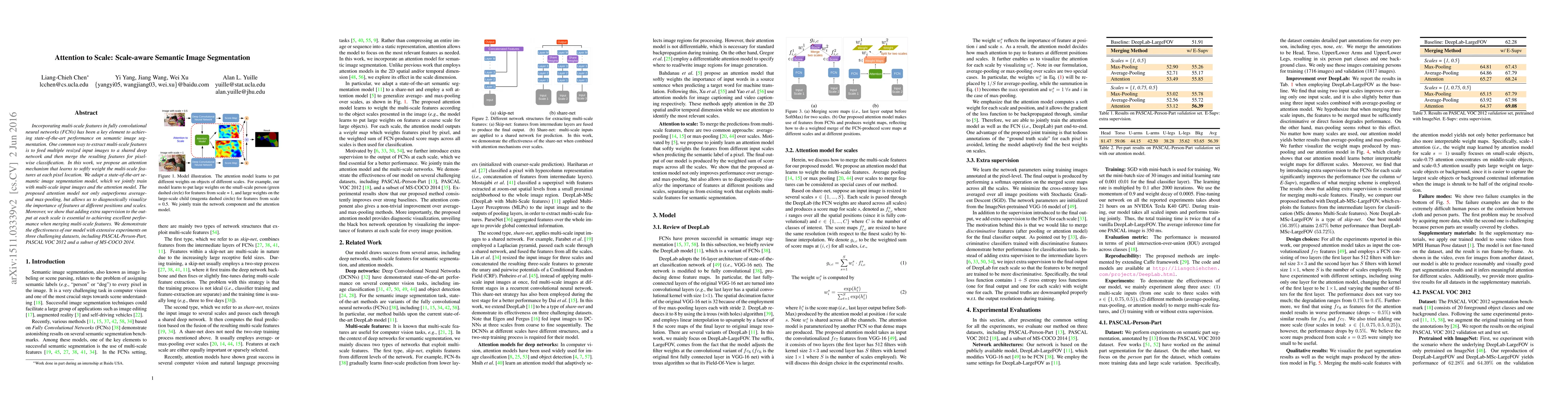 This paper proposes an attention mechanism to softly weight multi-scale features in fully convolutional networks for semantic image segmentation, outperforming average- and max-pooling methods. The model is trained with multi-scale inputs and extra supervision at each scale, achieving superior performance on PASCAL-Person-Part, PASCAL VOC 2012, and MS-COCO datasets.