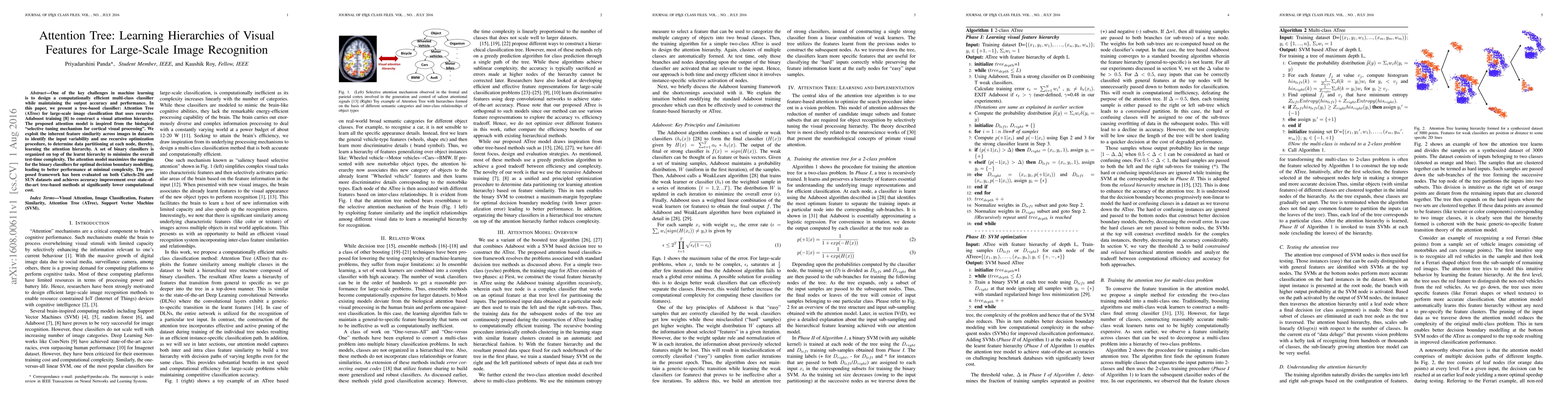 The paper introduces Attention Tree (ATree), a tree-based classifier for large-scale image recognition that uses recursive Adaboost to construct a hierarchical attention model inspired by biological visual processing. The method achieves improved accuracy and lower computational costs compared to state-of-the-art tree-based methods.