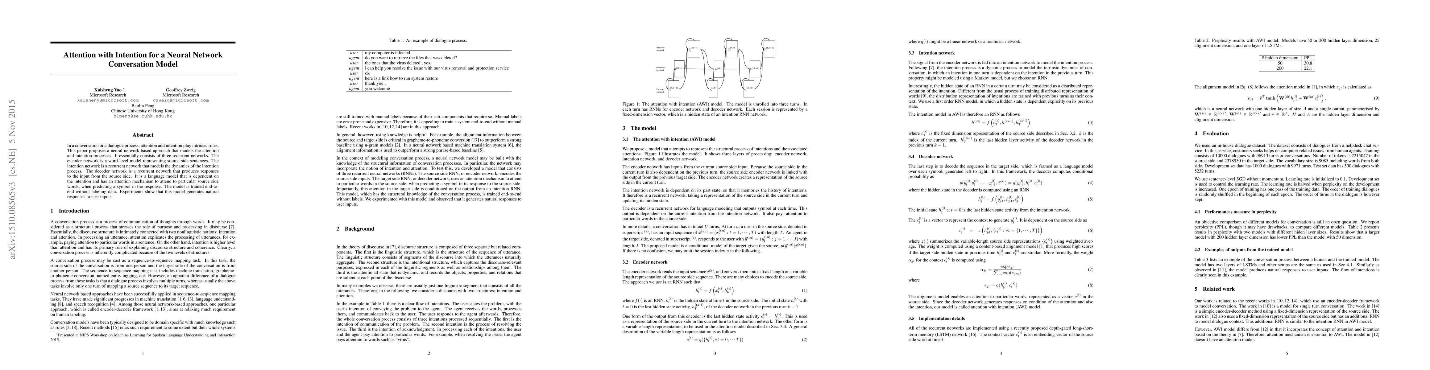 A neural network model is proposed that incorporates attention and intention in conversation, achieving natural responses to user inputs without labeled data.